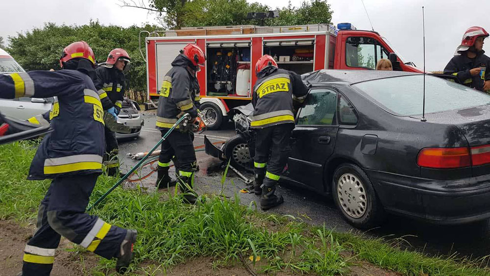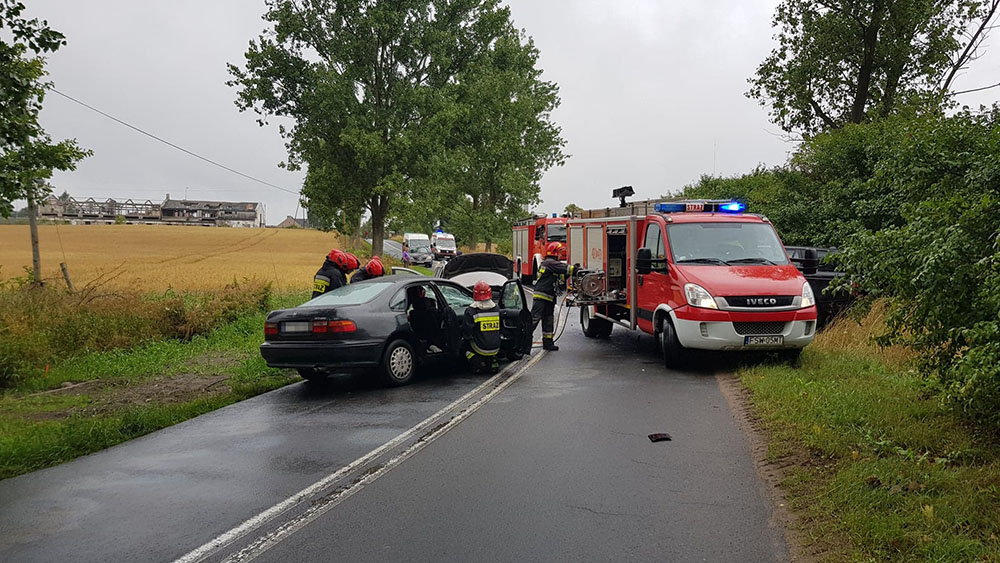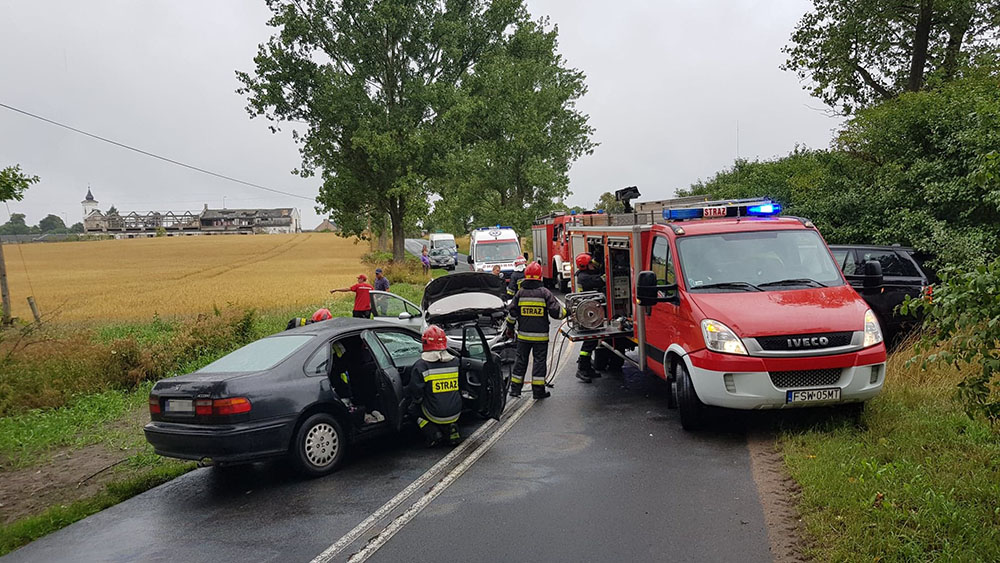 Na miejsce dojechały służby ratunkowe. Świebodzińscy strażacy przy pomocy sprzętu hydraulicznego zaczęli uwalniać kierującego hondą Na miejscu są już karetki pogotowia ratunkowego. Na miejsce jedzie świebodzińska policja.