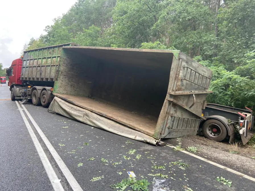 Renault wypadło z drogi. Samochód leży na poboczu bardzo mocno rozbity. Jedna z przyczep ciężarówki przewróciła się i zablokowała drogę.
