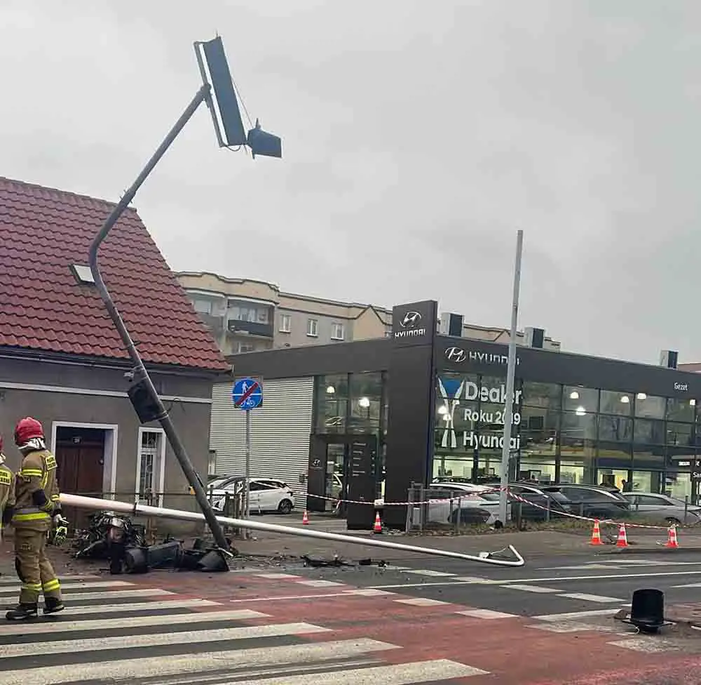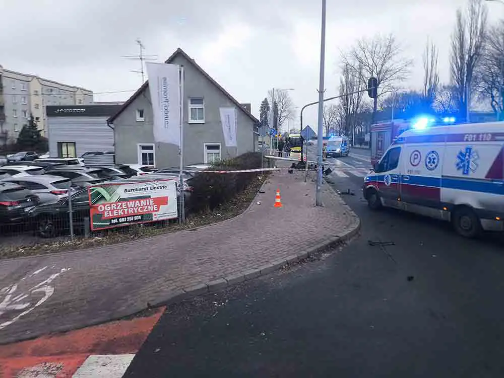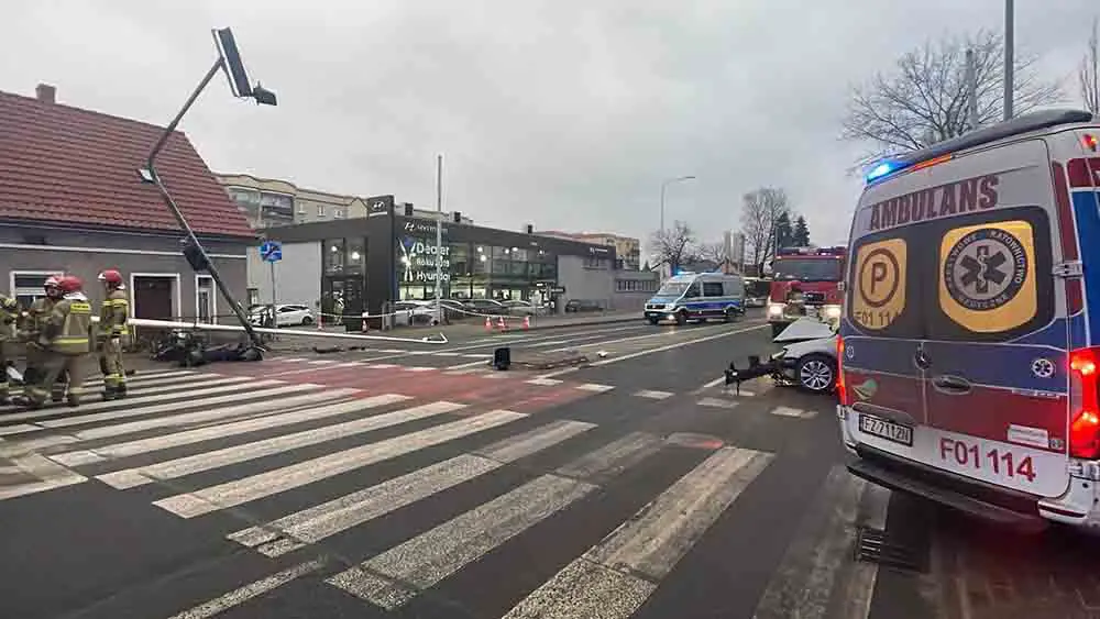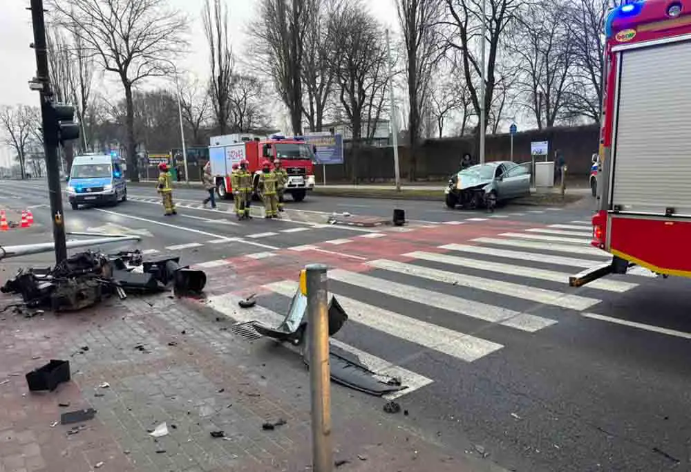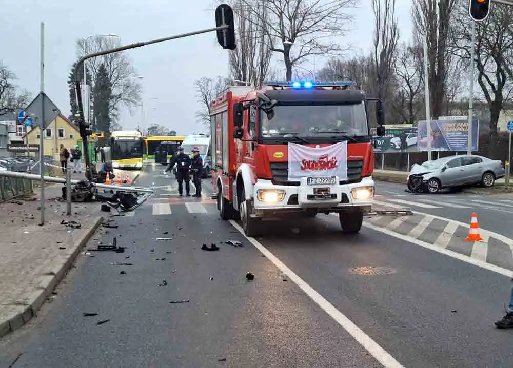 Volkswagen wypadł z drogi z dużą siłą uderzył w lampę przy salonie hyundaia na ulicy Sulechowskiej. Lampa upadła na sygnalizację świetlną demolując ją. Na miejsce dojechały wozy straży pożarnej, policja oraz karetka pogotowia ratunkowego. Siła uderzenia była tak duża, że z volkswagena został wyrwany silnik. Na chodniku zasłabła kobieta. – Źle się poczuła pod wpływem emocji widząc zdarzenie – mówi st. kpt. Piotr Kowalski, rzecznik zielonogórskiej straży pożarnej. Jak mówi podkom. Bartosz Zawada, naczelnik zielonogórskiej drogówki, osoba piesza została przewieziona do szpitala.