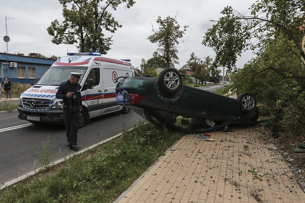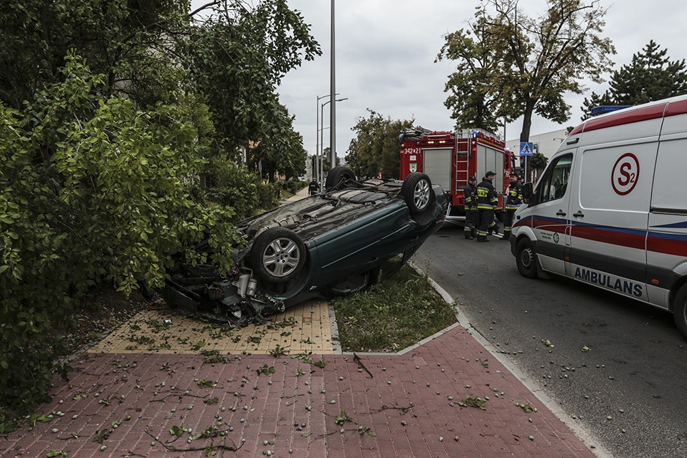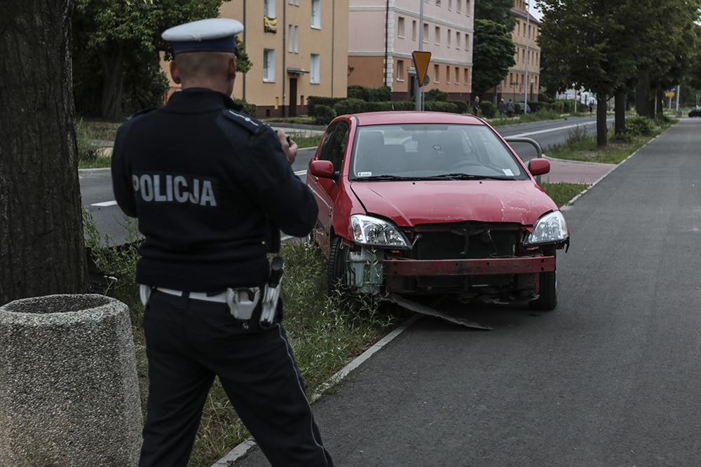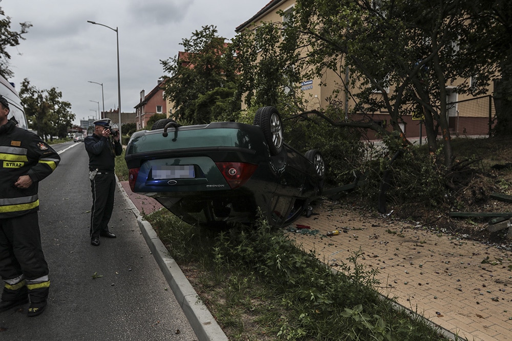 Ford musiał jechać z dużą szybkością, bo po zderzeniu wypadł z drogi. Ford roztrzaskał ławkę i uderzył w drzewo. Na koniec auto dachowało. Na szczęście nikogo nie było na chodniku. Gdyby byli tam piesi doszłoby do tragedii.