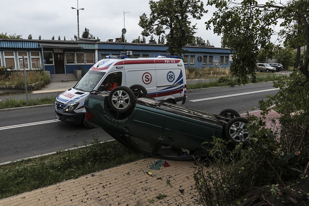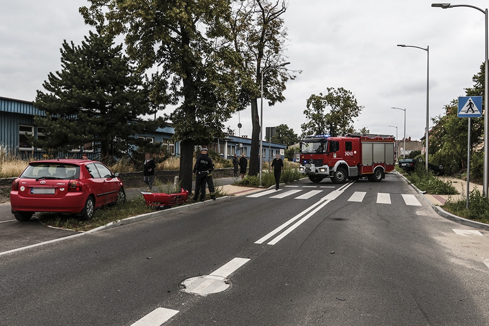 Do poważnego wypadku doszło we wtorek, 16 lipca, na ul. Dworcowej. Ford zderzy się z toyota, wypadł z drogi i dachował. Kierowca forda został zabrany do karetki.
