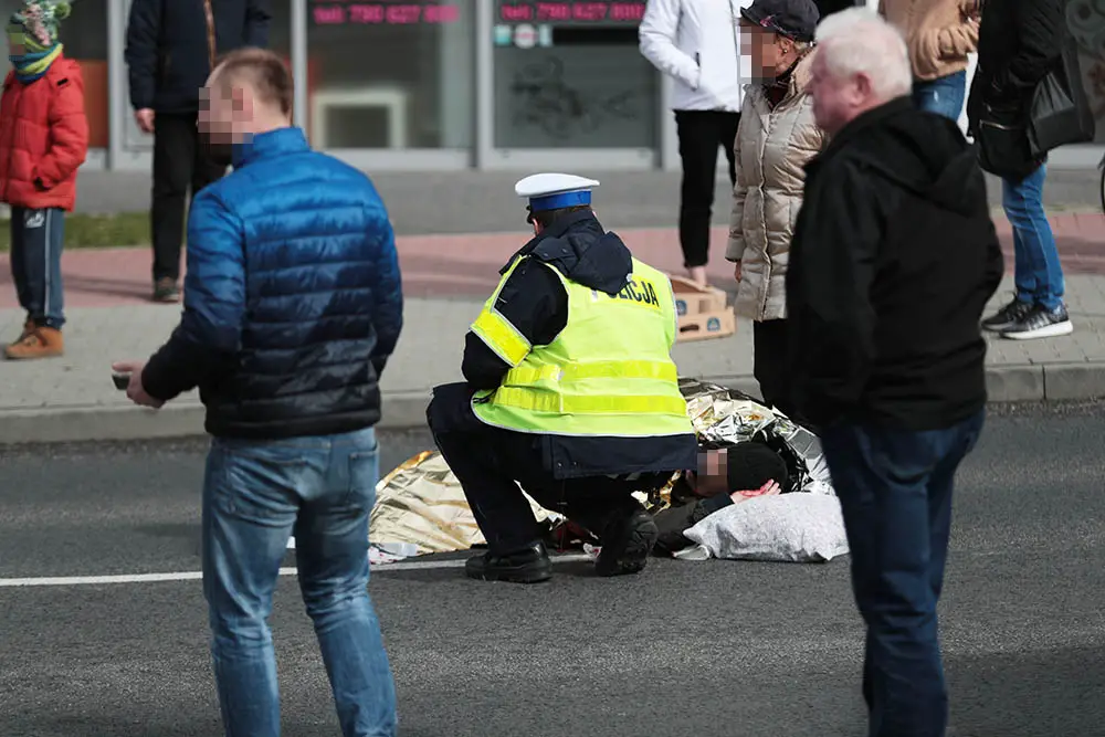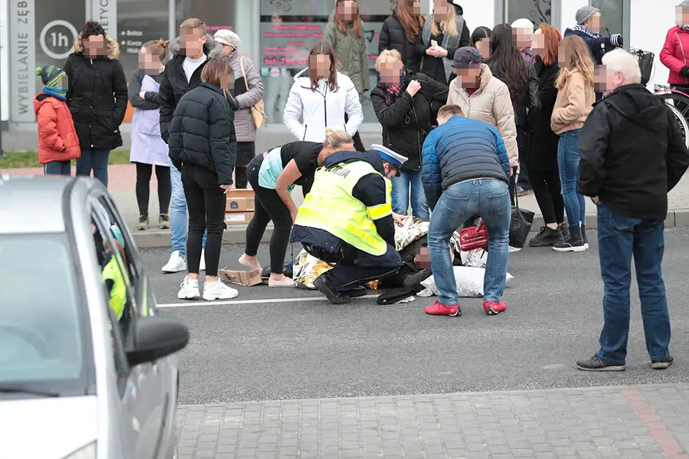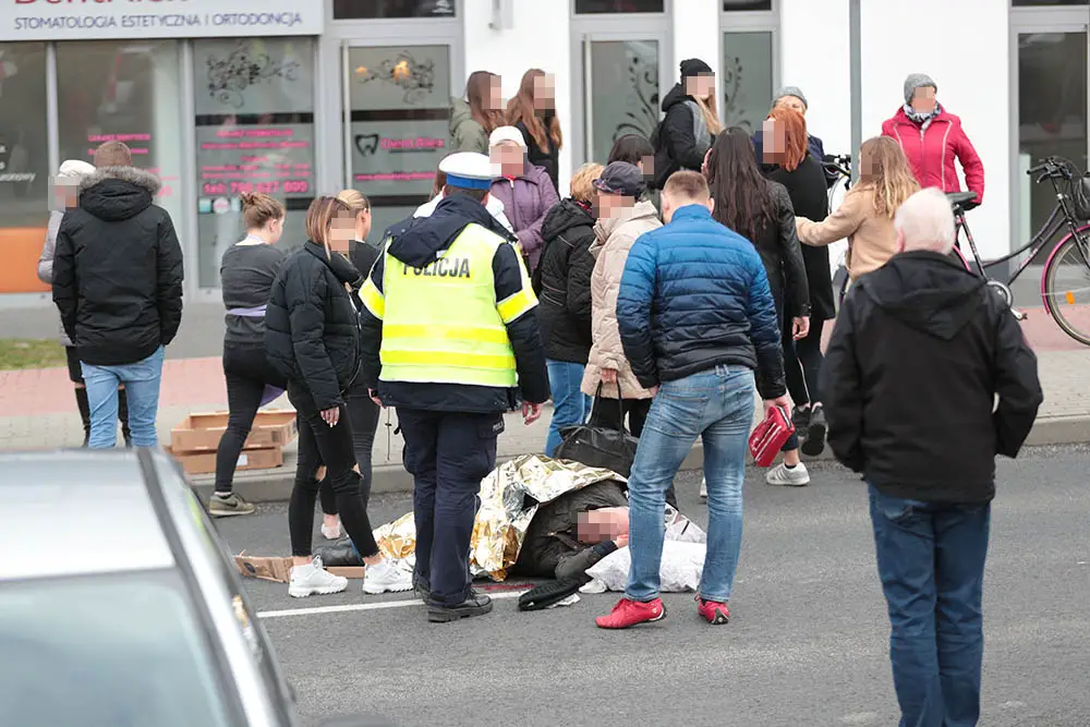 Mężczyzna był już na przejściu dla pieszych. Ulicą Michalskiego w kierunku ul. Ptasiej jechał kierujący fordem. Z dużą siłą potrącił pieszego, który upadł daleko od przejścia. Na pomoc potrąconemu ruszyli piesi oraz inni kierowcy.
