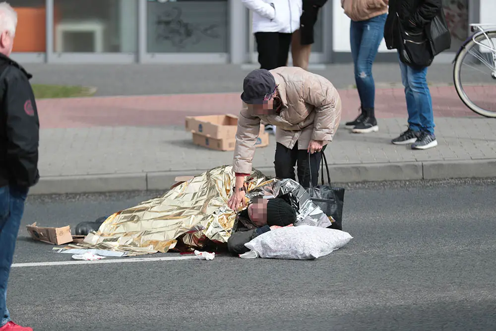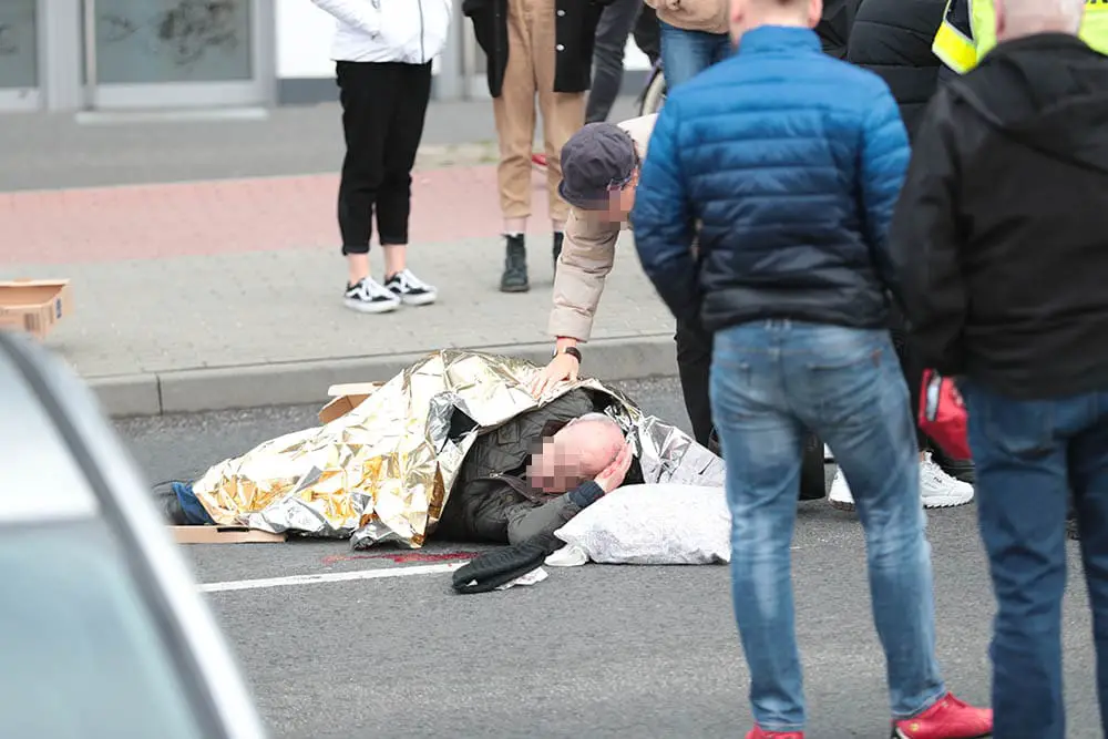 Na miejsce została wezwana karetka pogotowia ratunkowego oraz zielonogórska drogówka. Ludzie okryli rannego mężczyznę folią termiczną. Ranny mężczyzna został zabrany do szpitala. Nie wiedział co się stało. Nie mógł poruszać nogami.