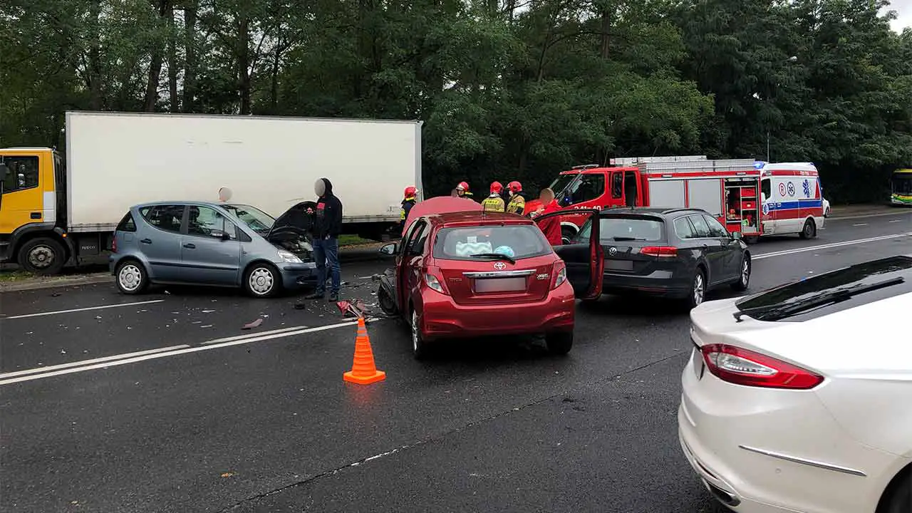 Kierowca volkswagena, który jechał w kierunku centrum, zaczął hamować przed przejściem dla pieszych, na którym było czerwone światło. Jadąca obok toyota nie zdążyła zahamować i aby uniknąć zderzenia zjechała na przeciwległy pas ruchu. Tam doszło do zderzenia z mercedesem, skodą oraz ciężarowym iveco.