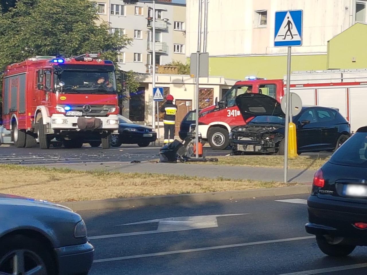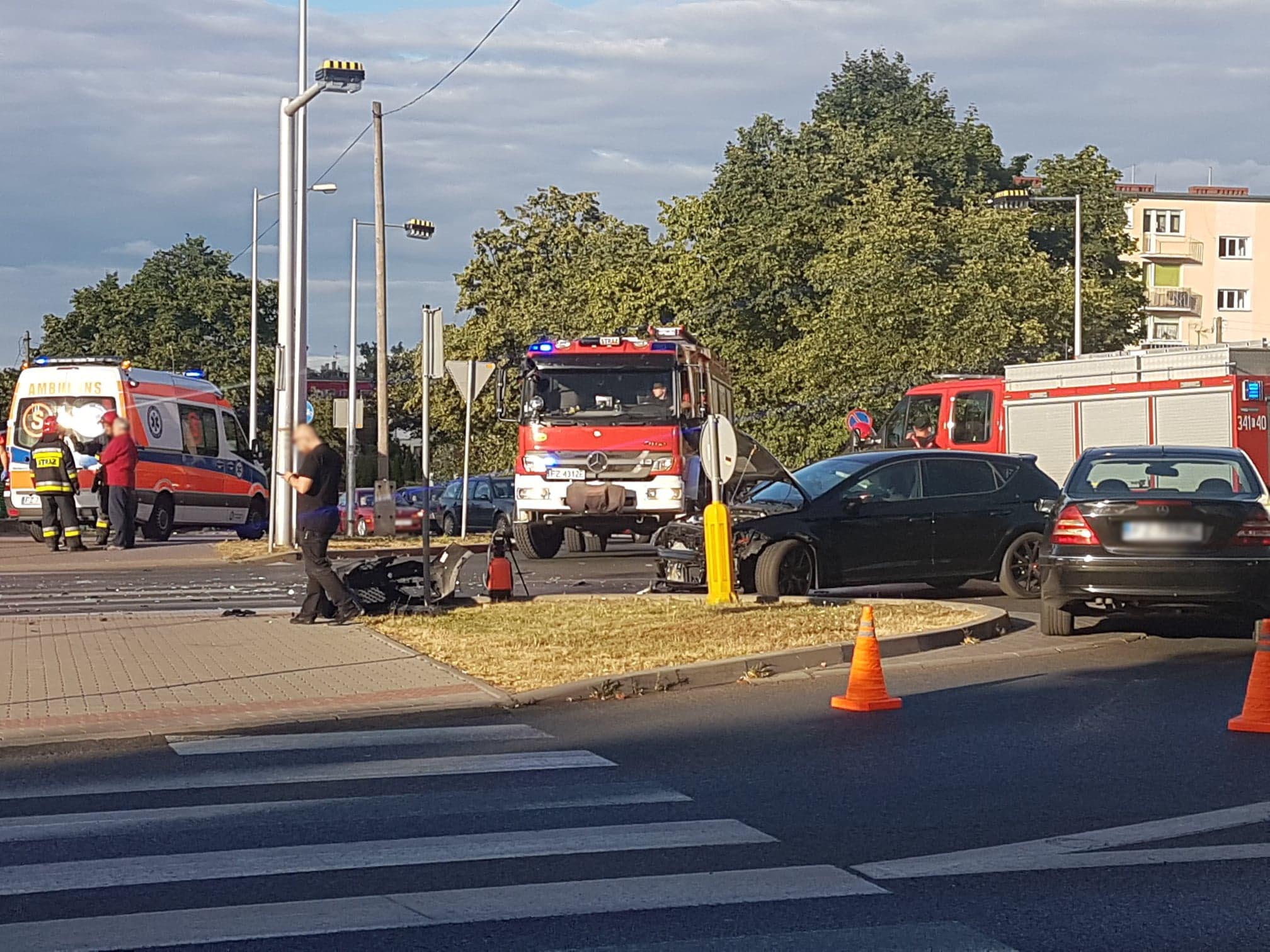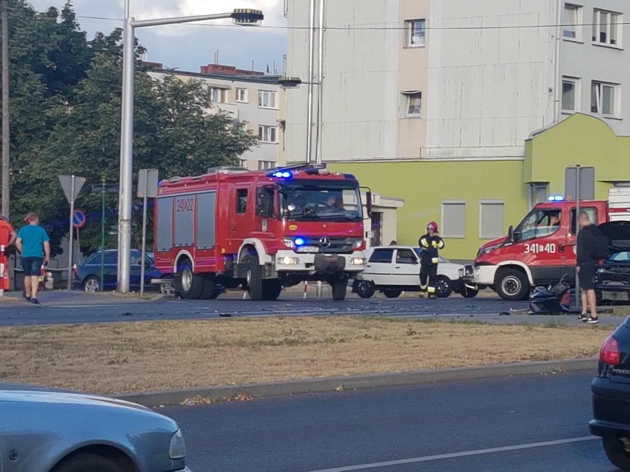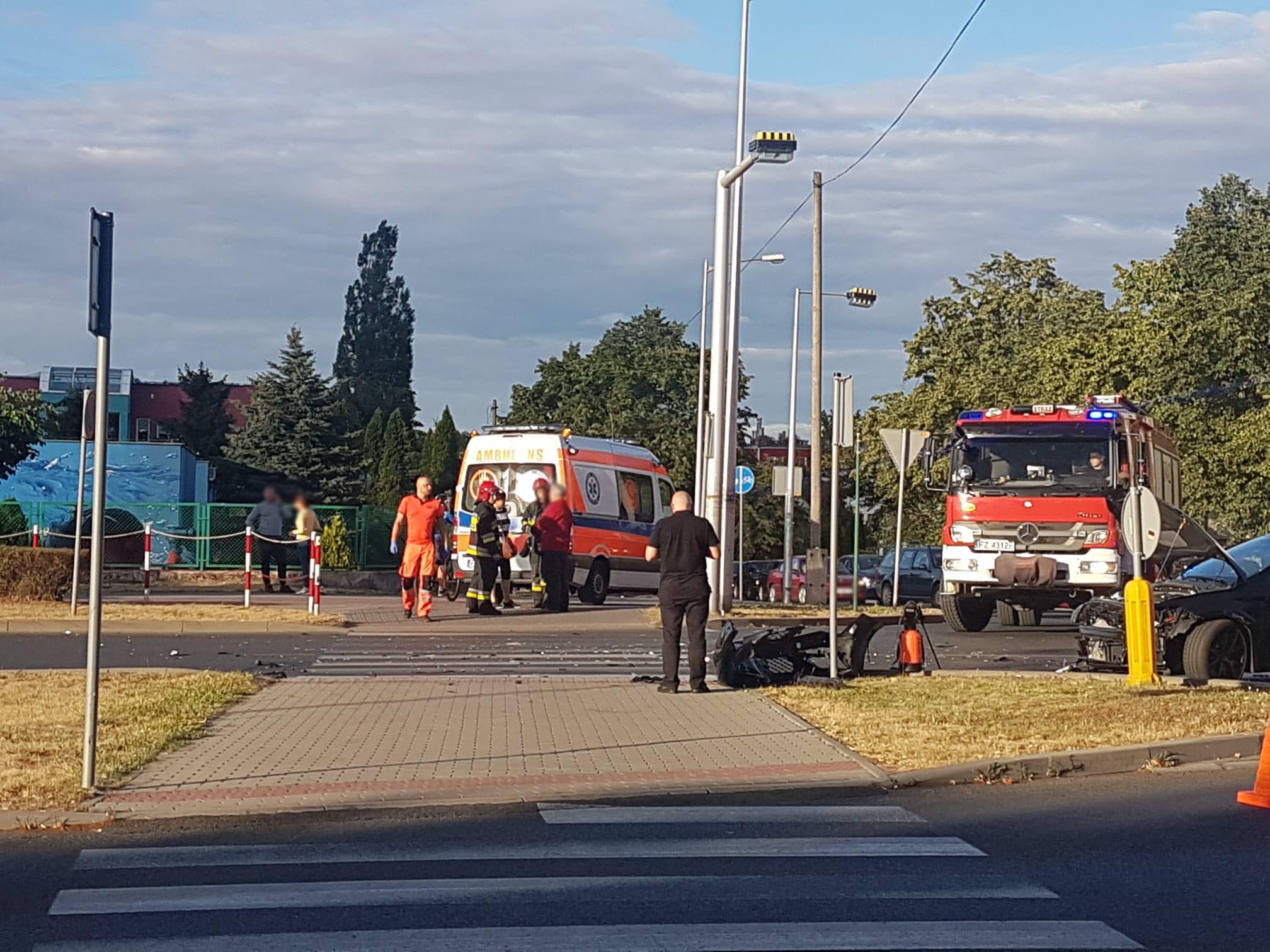 Na miejscu zdarzenia znajdują się dwa wozy straży pożarnej oraz karetka pogotowia ratunkowego. Siła zderzenia pojazdów była bardzo duża. Oba pojazdy zostały mocno zniszczone.