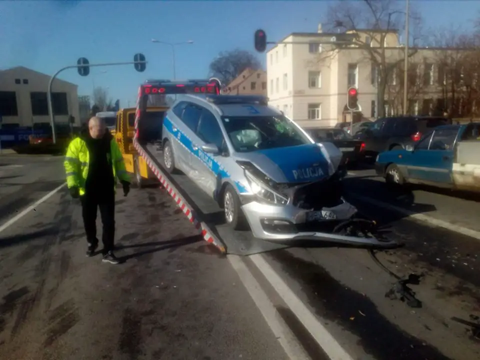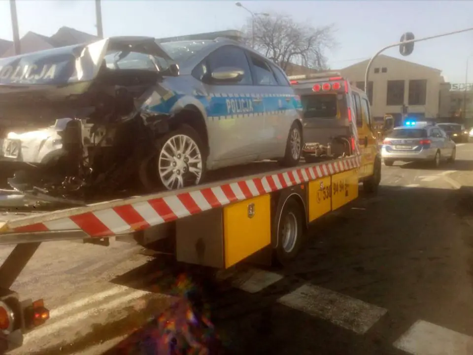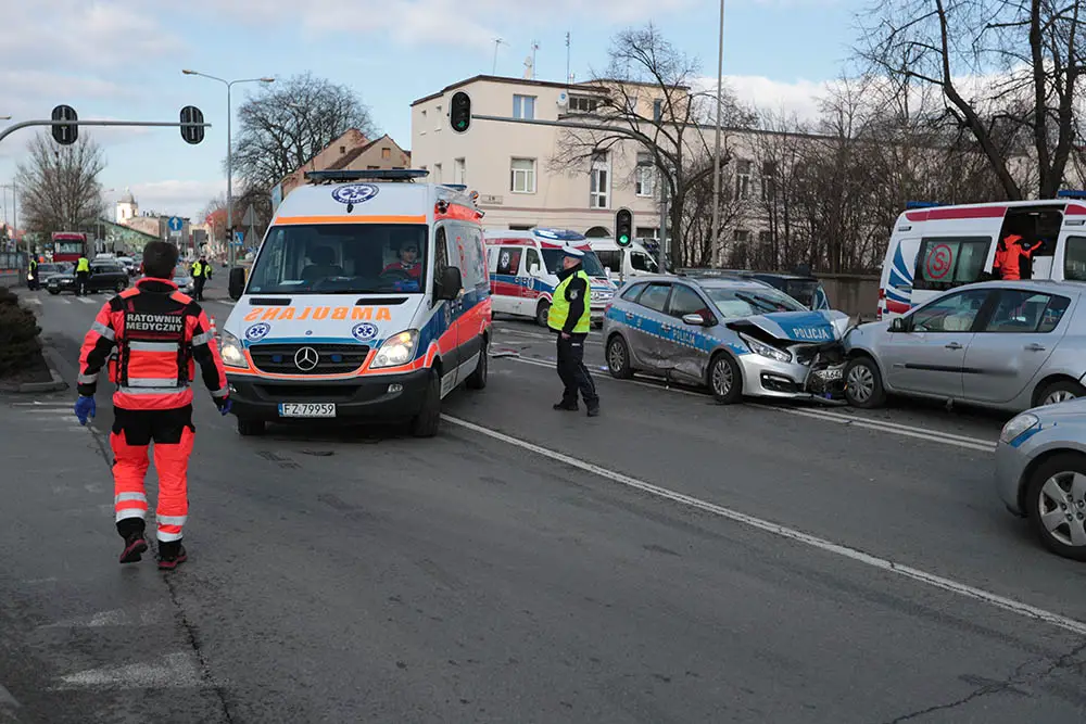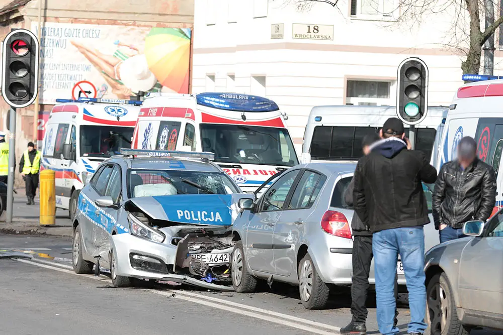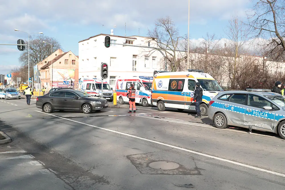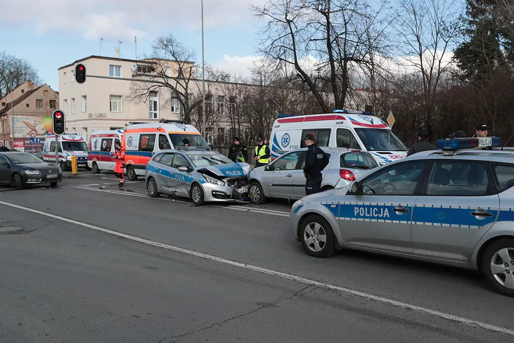 Do wypadku doszło w piątek, 22 lutego, na ul. Wrocławskiej przy skrzyżowaniu z ul. Sienkiewicza. Radiowóz jadący na sygnałach zderzył się z dwoma samochodami, z jednym z nich czołowo. Rannych zostało pięć osób, w tym dwaj policjanci i przewożony przez nich mężczyzna. Jeden z policjantów leżał koło radiowozu.