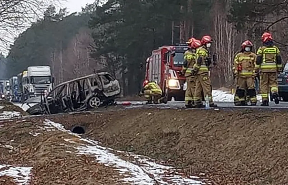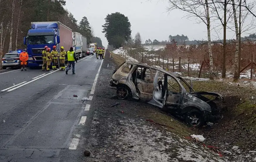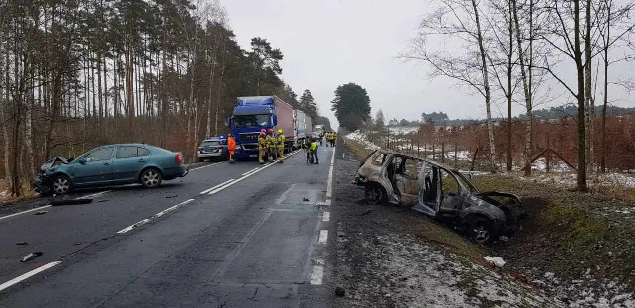 W zawracającą skodę uderzył kierujący fordem, który wyprzedzał ciężarówki. Po zdarzeniu ford zapalił się. – 10-letni chłopiec jadący fordem z poparzeniami trafił śmigłowcem, do szpitala – mówi st. sierż. Biernacka. Kierujący oraz pasażerka do szpitala zostali zabrani karetkami.