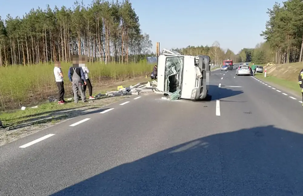 Do wypadku doszło przed godz. 17.00. Kierujący fordem fiesta zderzył się z dostawczym citroenem jumperem. Citroen przewrócił się na drogę. Przewoził betonowe elementy, które wypadły na jezdnię i pobocze. Fiesta wylądowała na poboczu. Ford ma mocno rozbity przód i bok.