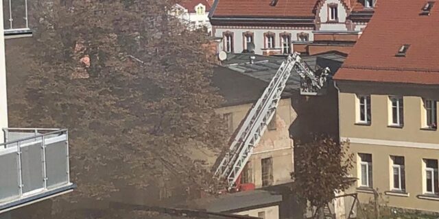 Godz. 13.25 Z dachu widać wydobywający się ogień. Strażacy piłami tną dach, żeby zalewać płomienie.