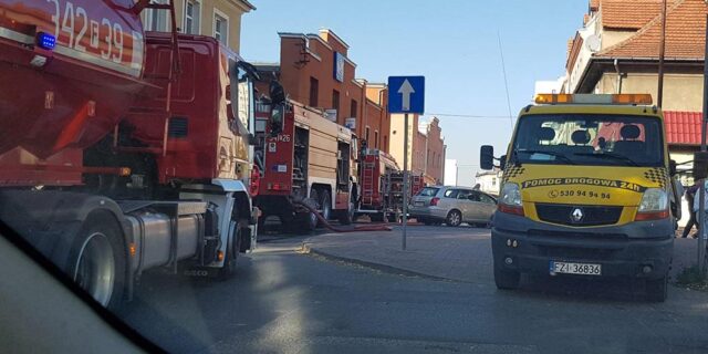 Na miejscu trwa walka z pożarem. Najprawdopodobniej to dach lokalu Piekarnia Cicha Kobieta. Na dachu są strażacy.