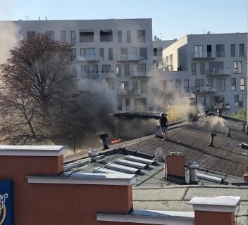Godz. 13.09 Dymu jest coraz więcej. Strażacy gaszą pożar z dachu oraz z podnośnika. Na miejscu jest również policja.