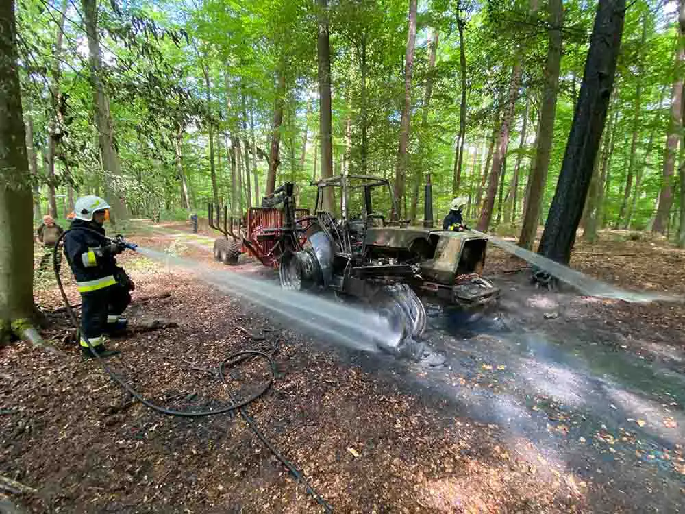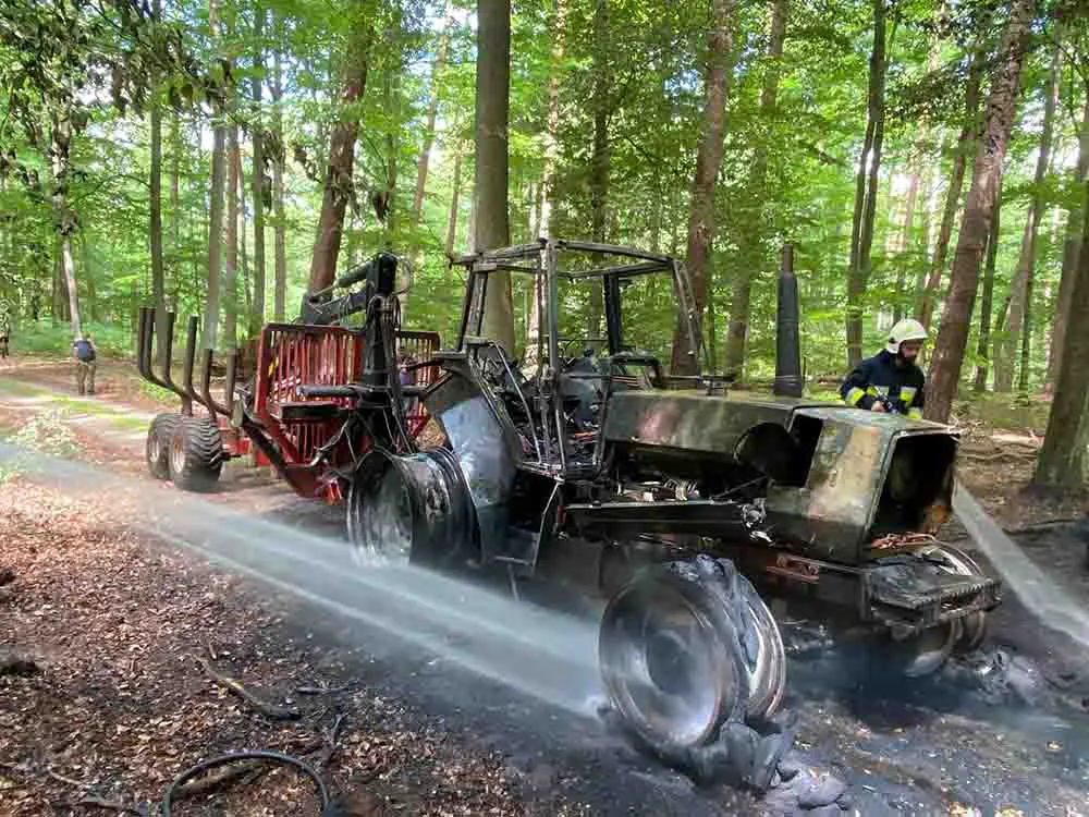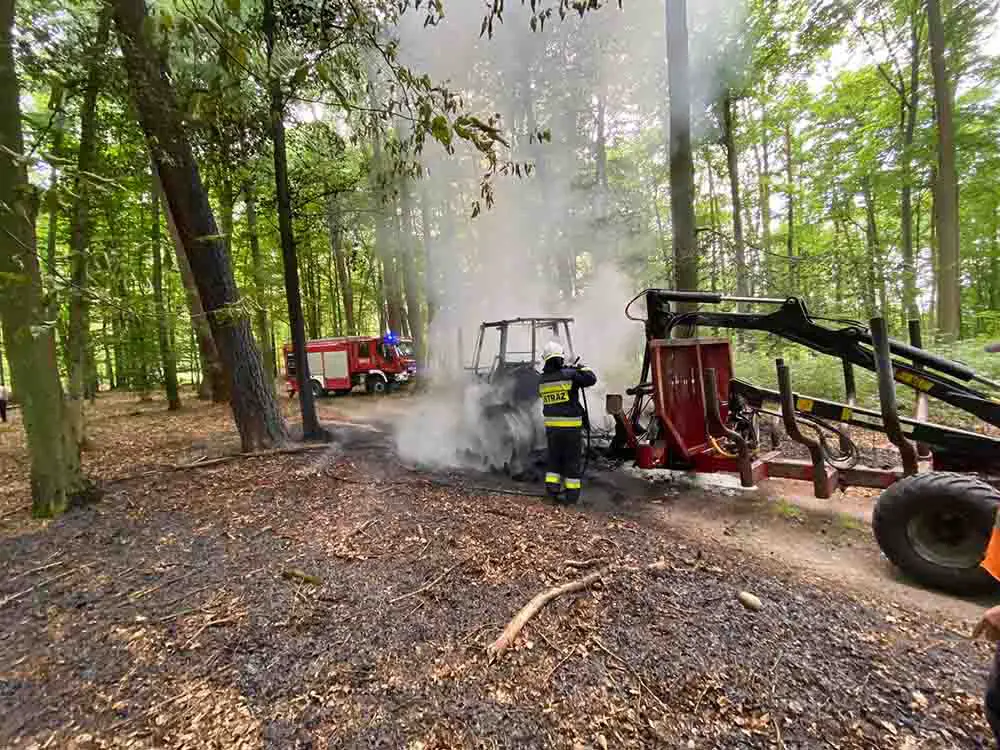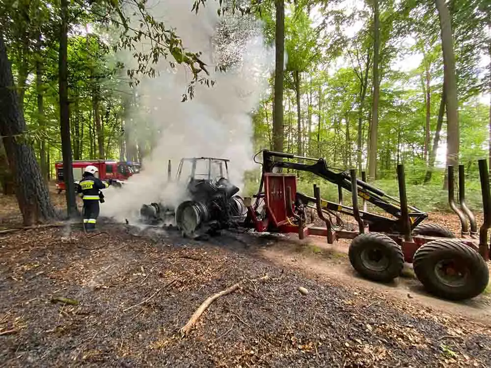 Do pożaru ciągnika z przyczepą doszło we wtorek, 23 czerwca, w lesie koło Kłodawy. Na miejsce szybko dojechały wozy straży pożarnej.