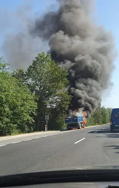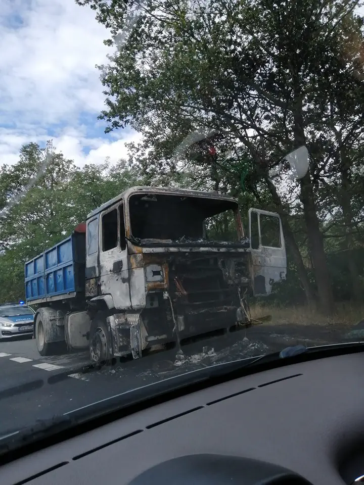 Godz. 10.54 Ciężarówka została już zgaszona przez strażaków. Na trasie są ogromne problemy w ruchu. Na drodze jest ogromny korek.