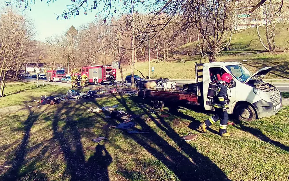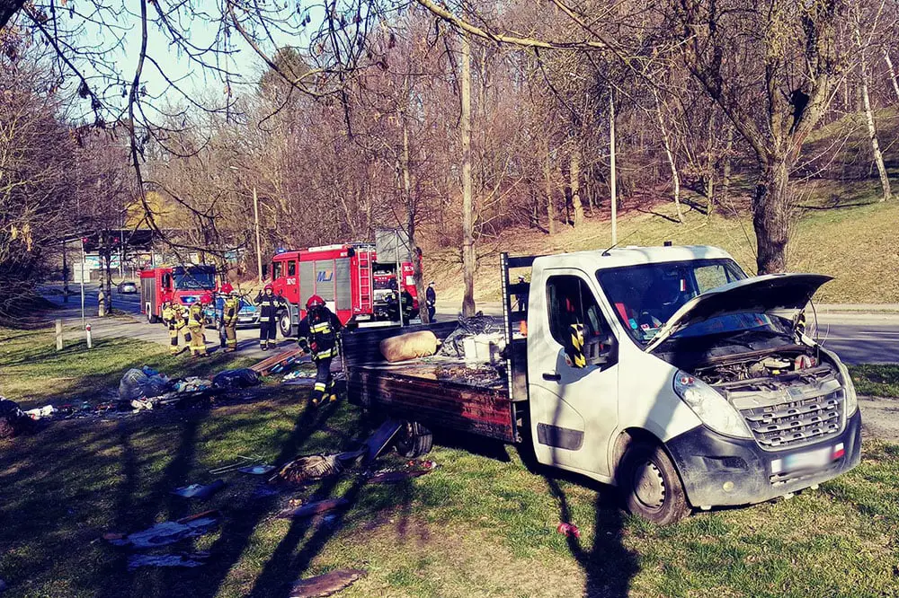 Samochód dostawczy jechał ul. Fredry. Po godz. 15.00 doszło do pożaru materiałów, które przewoził. Kierowca nie był w stanie sam poradzić sobie z ogniem. Na miejsce zdarzenia została wezwana straż pożarna. Dojechała również policja. Na szczęście strażacy szybko poradzili sobie z pożarem.