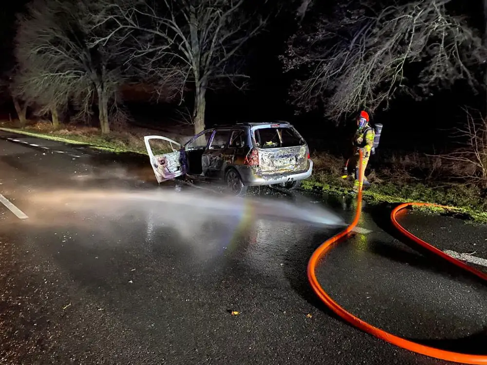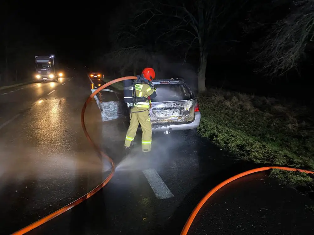 Samochód zapalił się podczas jazdy i błyskawicznie stanął w płomieniach. Na miejsce zdarzenia bardzo szybko dojechała zaalarmowana świebodzińska straż pożarna. Strażacy szybko poradzili sobie z pożarem zalewając ogień wodą. Niestety samochód spłonął doszczętnie. Na szczęście nikomu nic się nie stało.