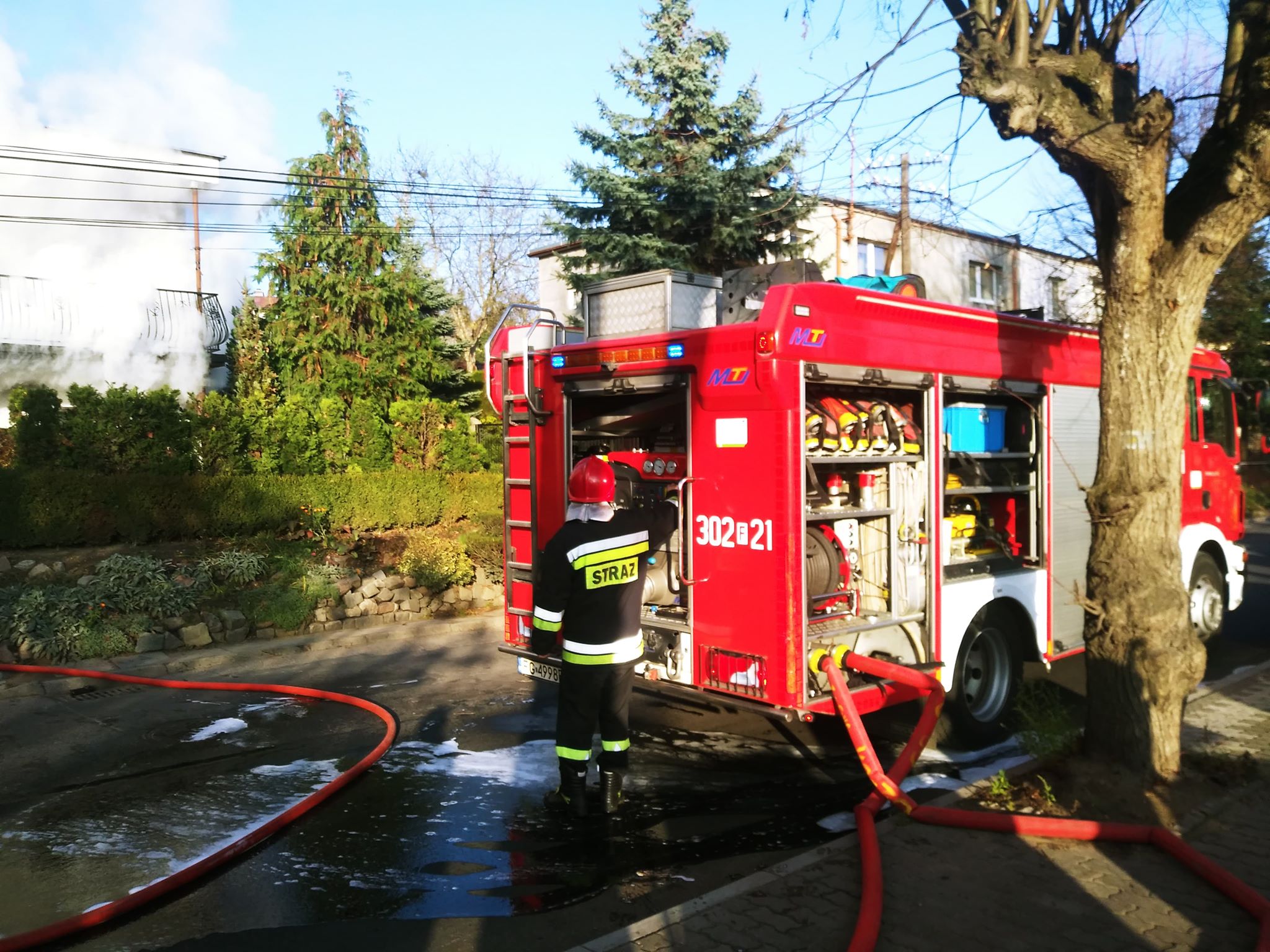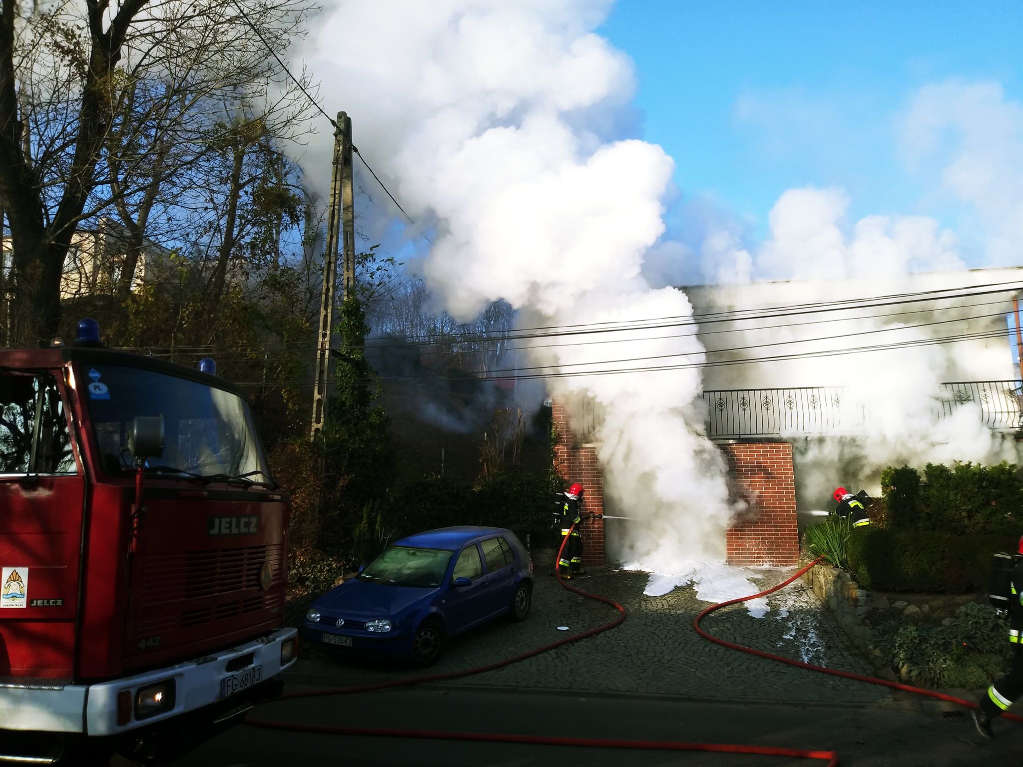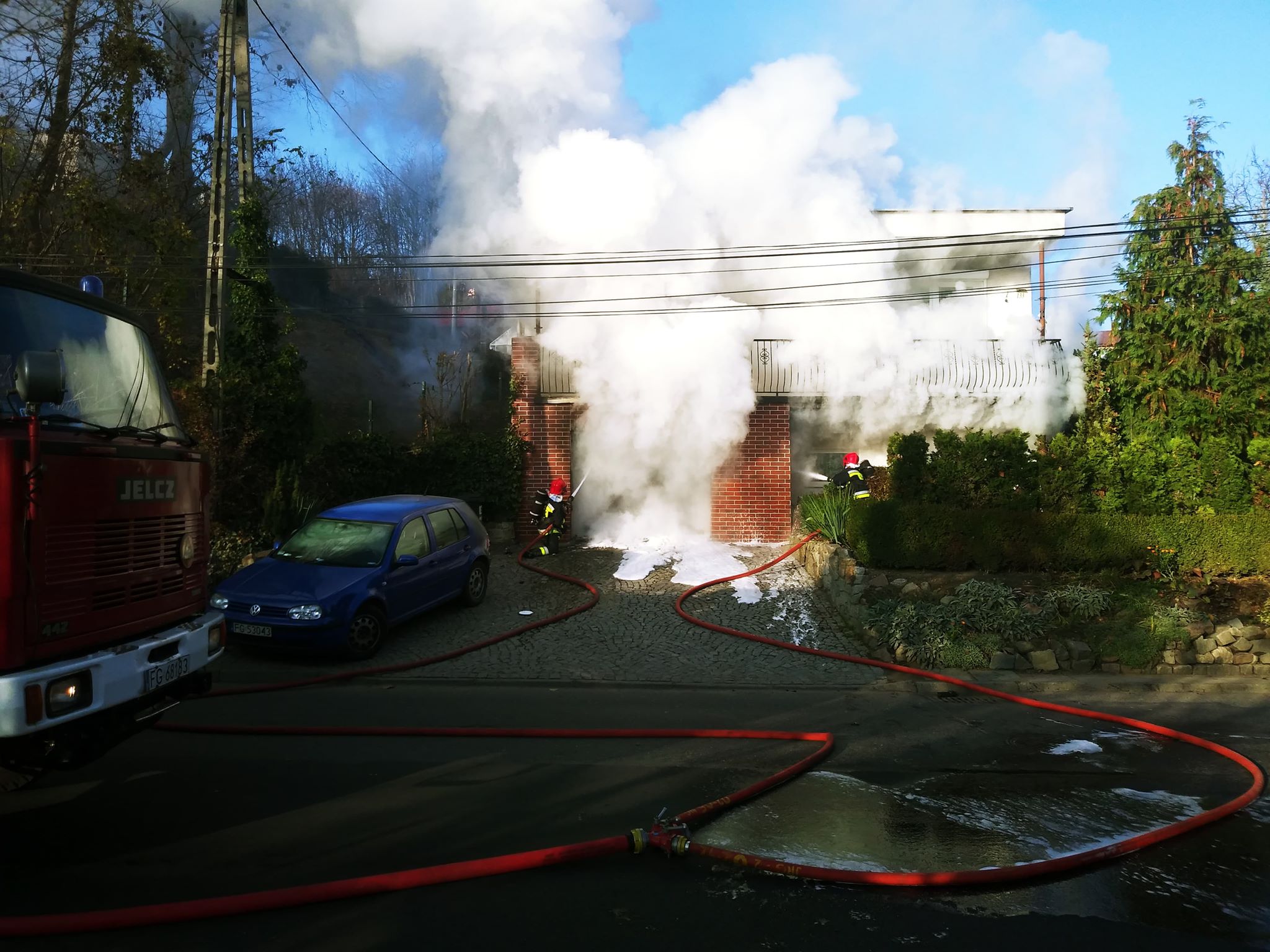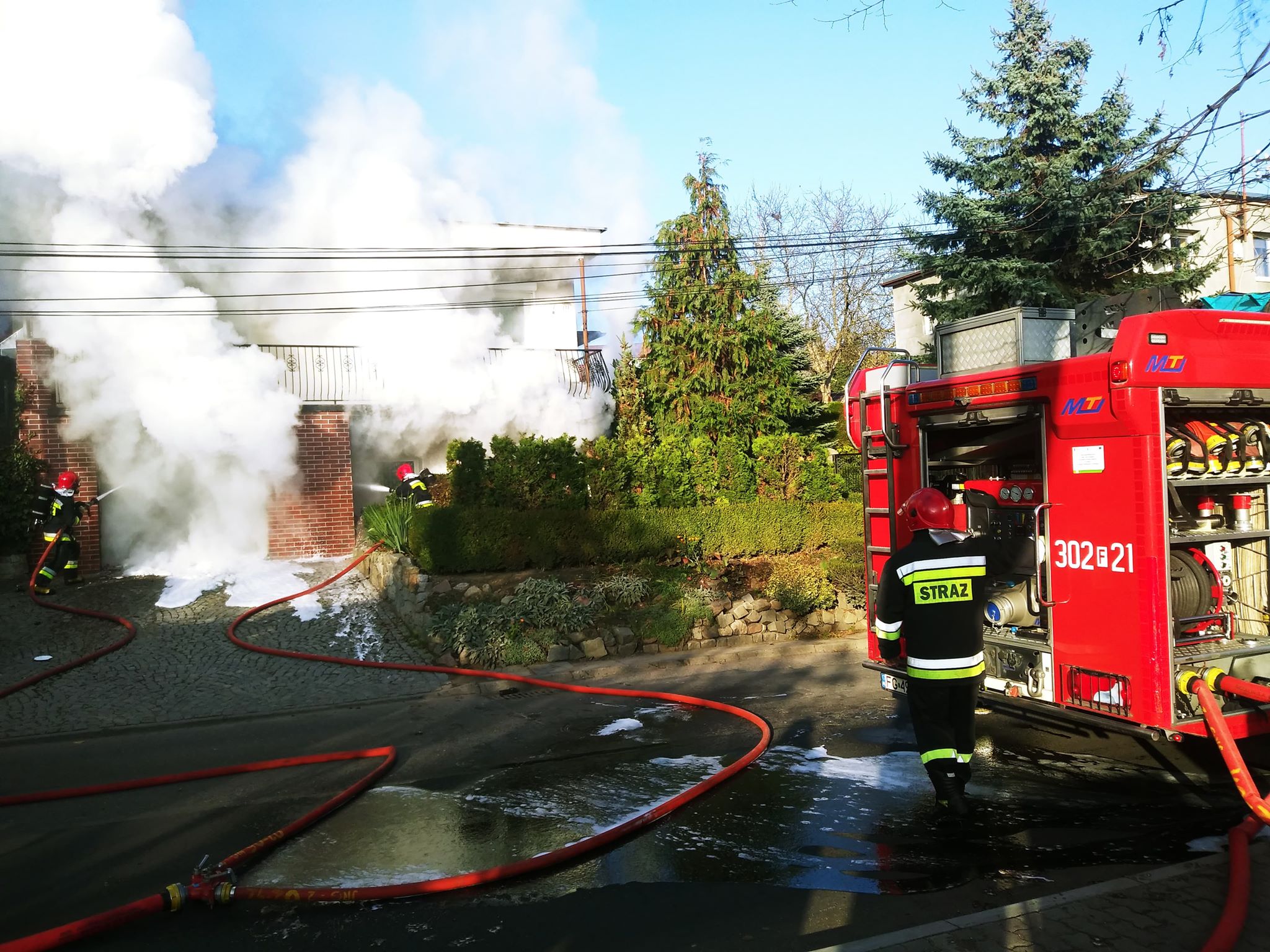Pożar wybuchł około godz. 14.00. Zapalił się samochód zaparkowany w garażu domu jednorodzinnego. Kiedy na miejsce dotarła straż pożarna gęsty dym widać było z wielu kilometrów, a z garażu buchał ogień.