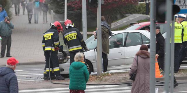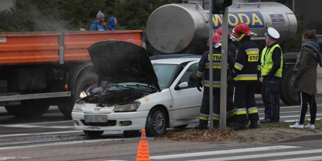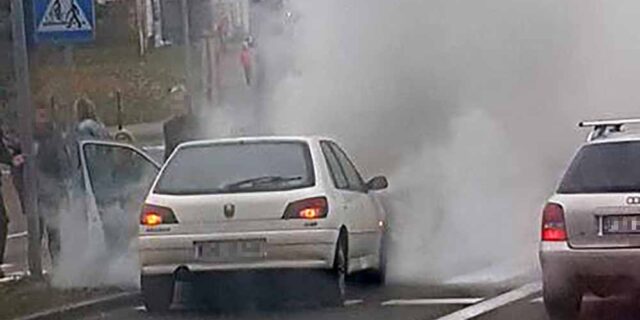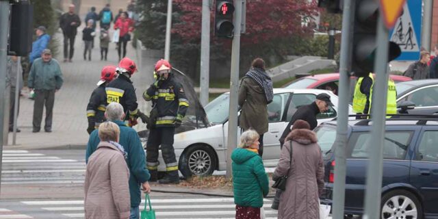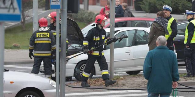 Do pożaru doszło po godz. 13.00 na al. Konstytucji 3 Maja przy skrzyżowaniu z ulicami Długą, Fabryczną i Moniuszki, Osobówka zapaliła się w czasie jazdy. Dym i ogień zaczęły wydobywać się z silnika peugeota.