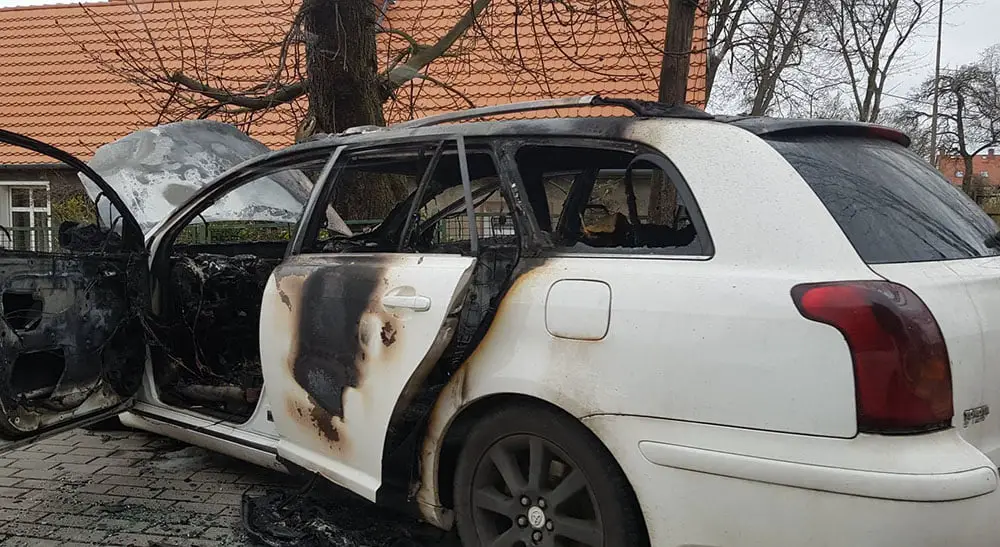 Toyota avensis zapaliła się w czasie jazdy na ul. Sienkiewicza. Pożar rozpoczął się w komorze silnika. Samochód bardzo szybko stanął w ogniu. Niestety, pożar niemal doszczętne zniszczył toyotę. W środku samochodu wszystko zostało spalone. Samochód nadaje się już tylko na złom.