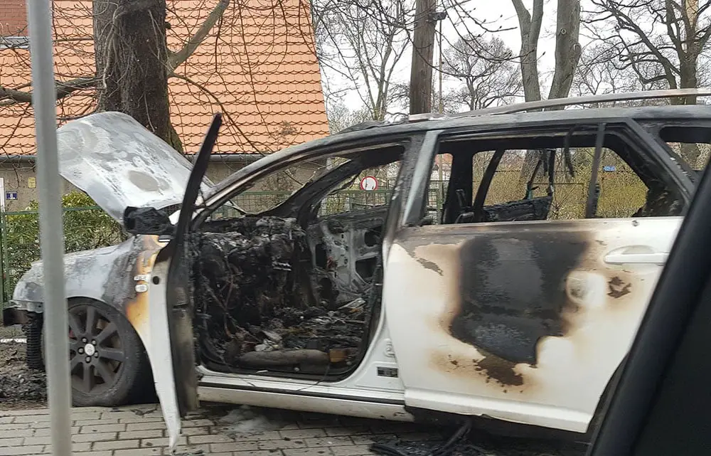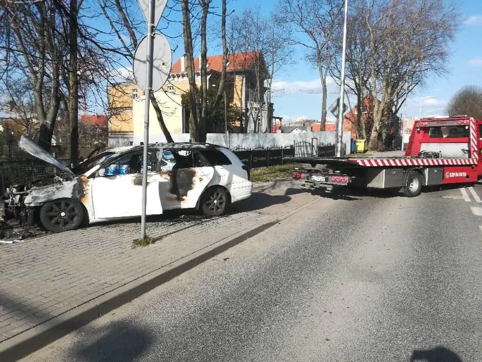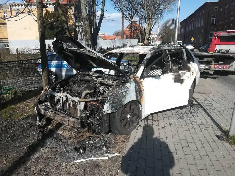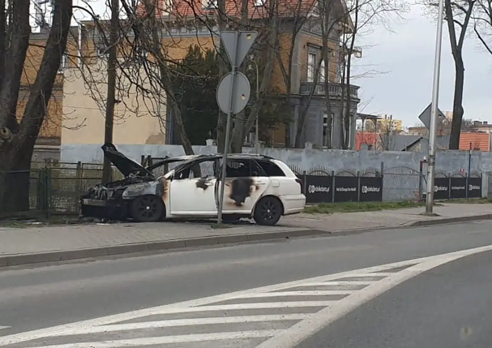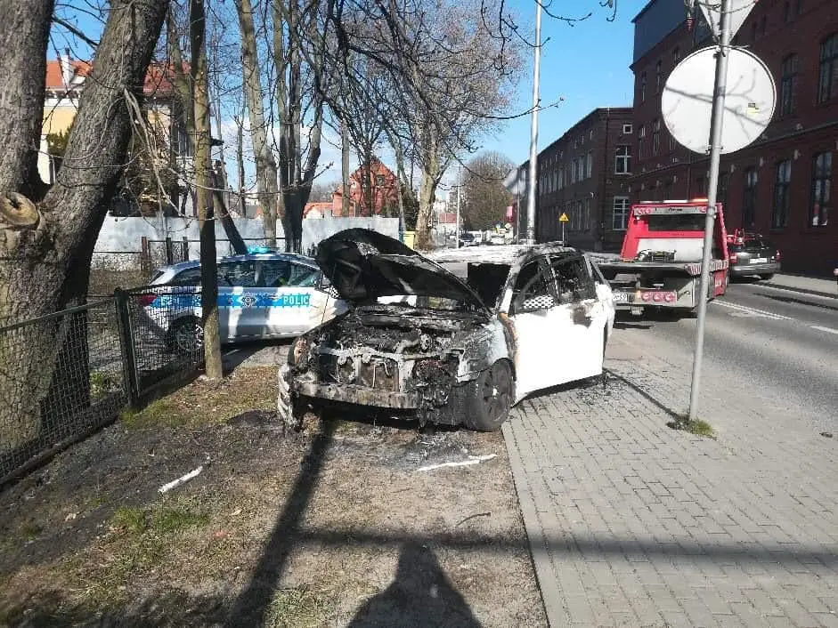Do pożaru samochodu doszło w sobotę, 4 kwietnia, na ul. Sienkiewicza. Samochód niemal spłonął doszczętnie.