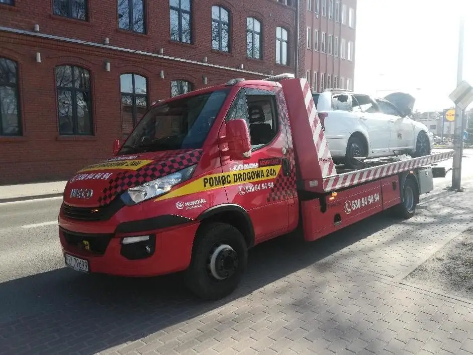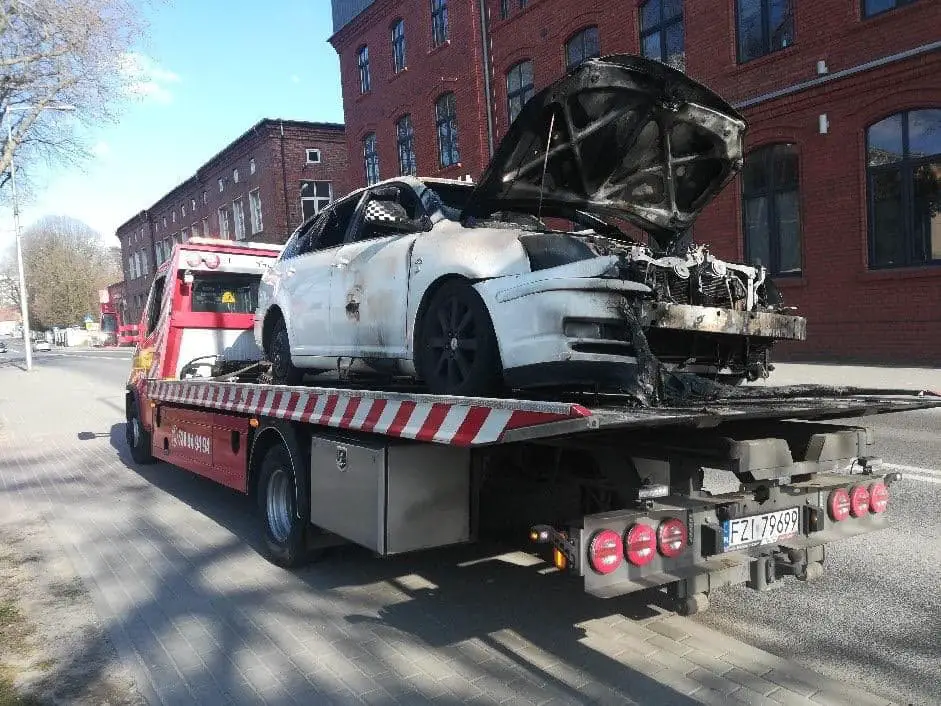 Spaloną toyotę na polecenie policji odholowała pomoc drogowa Maxmar