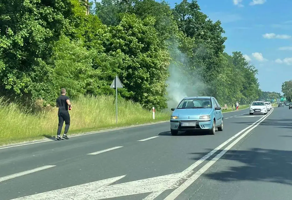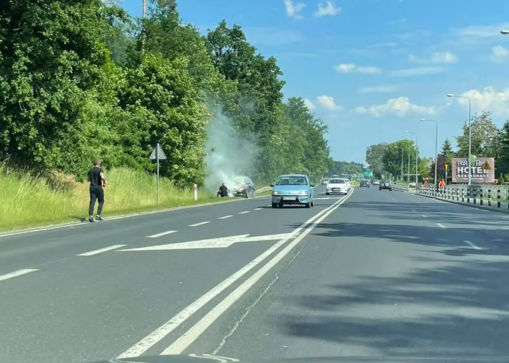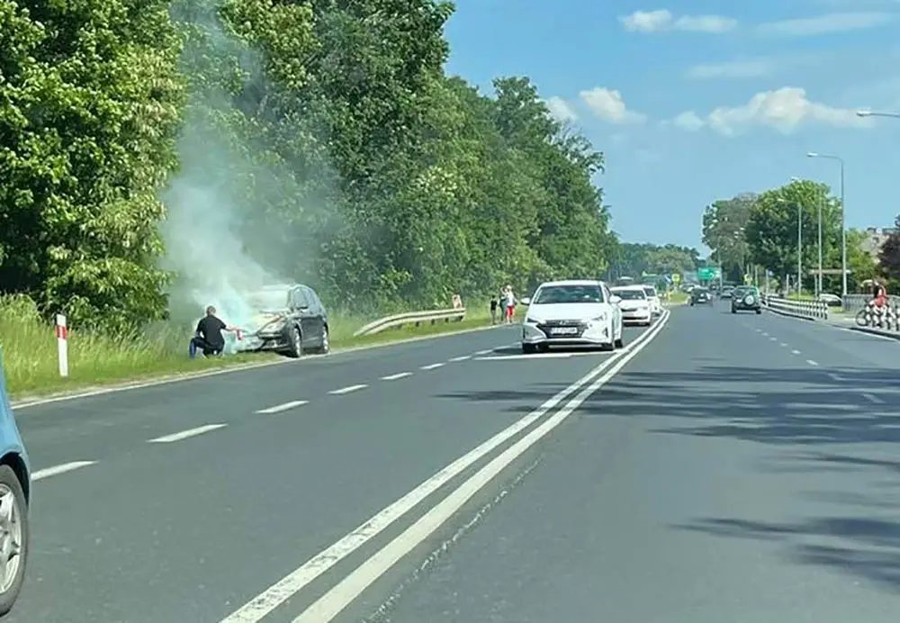 Kierujący zjechał na pobocze. Na pomoc ruszyli inni kierowcy z gaśnicami.