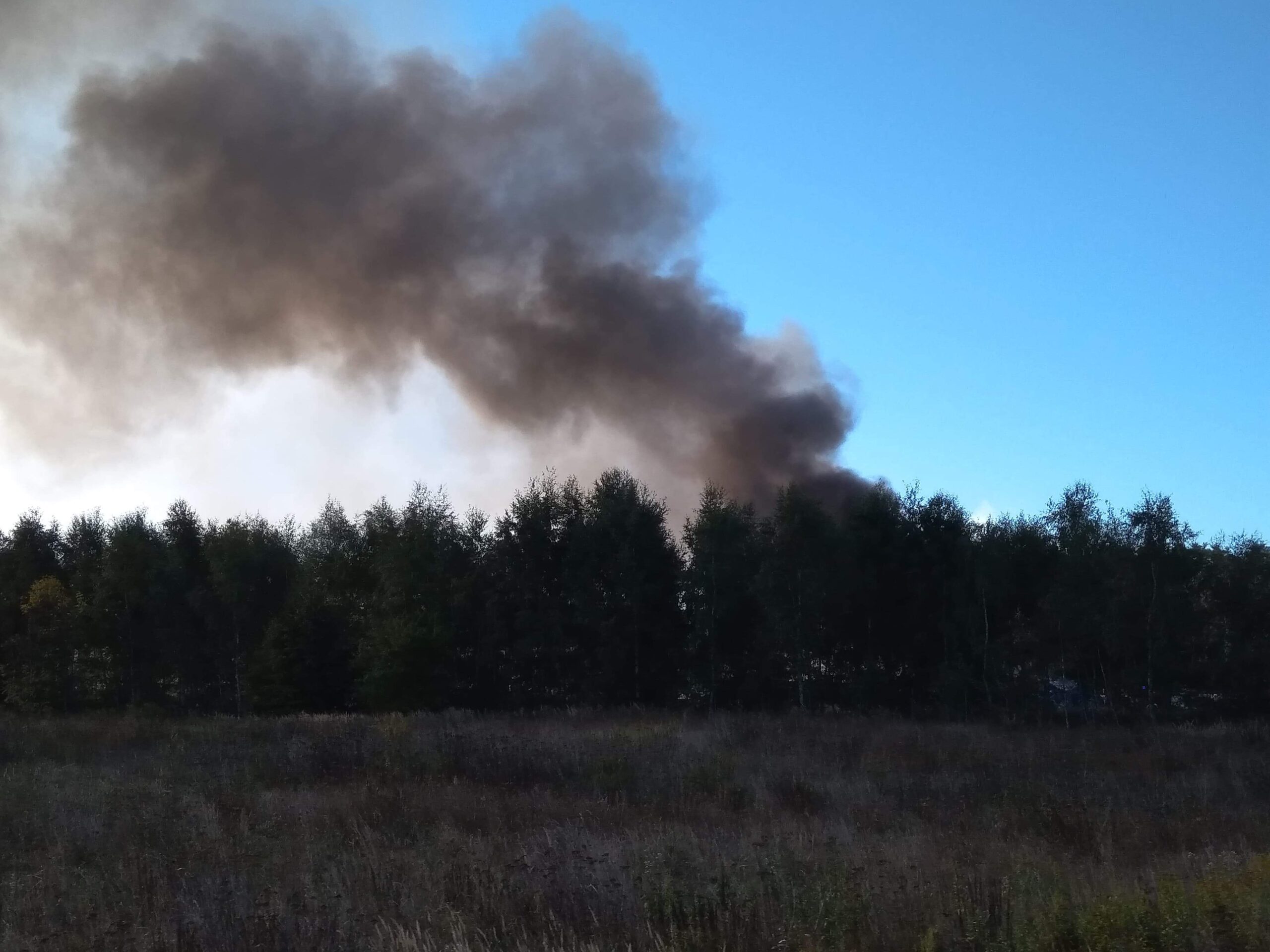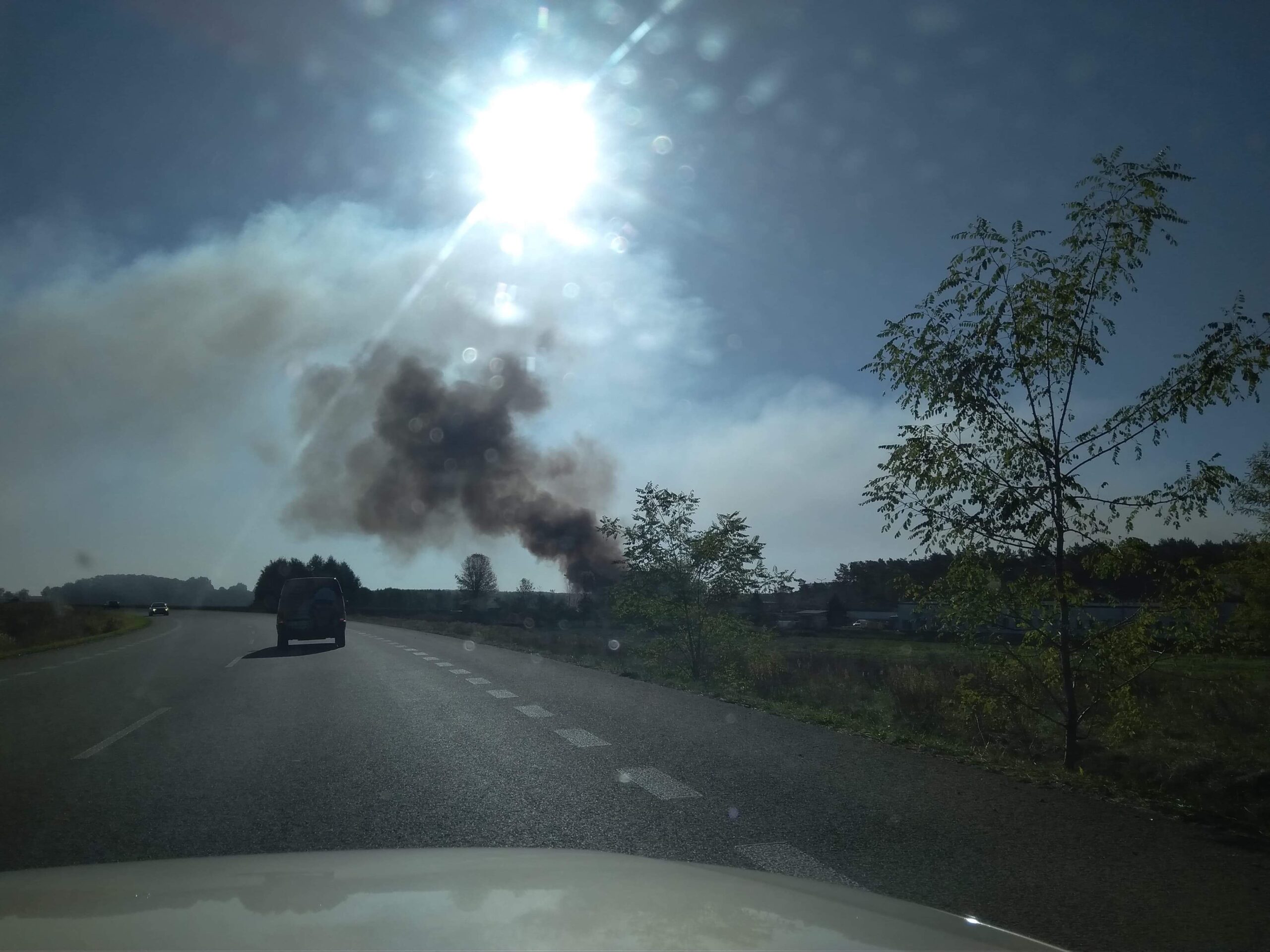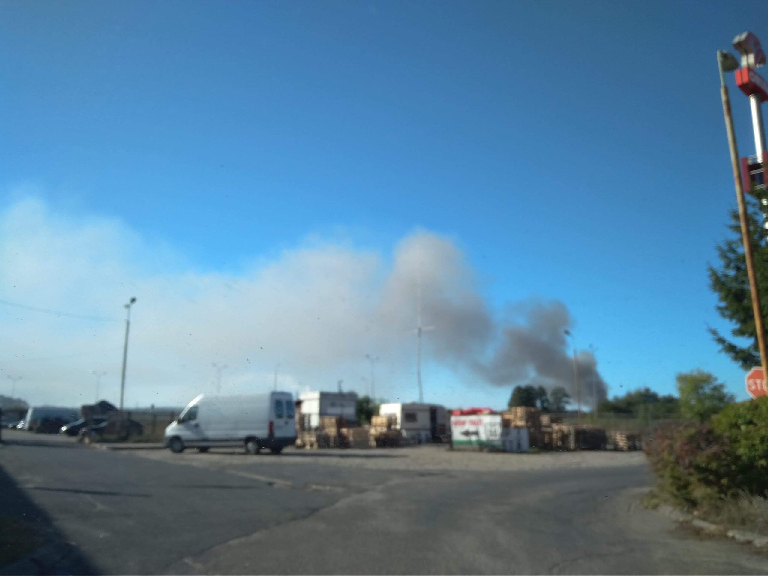 Z daleka widać czarny słup dymu, który unosi się nad składowiskiem.