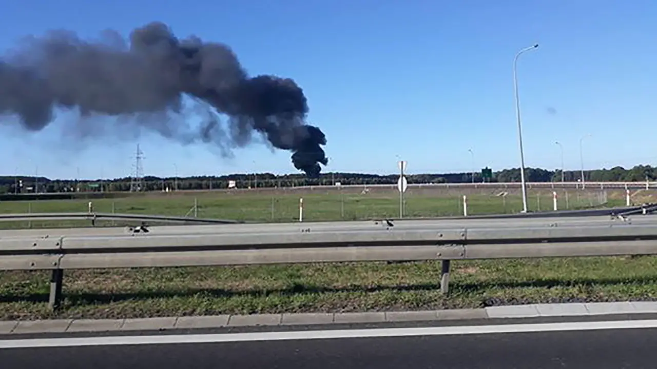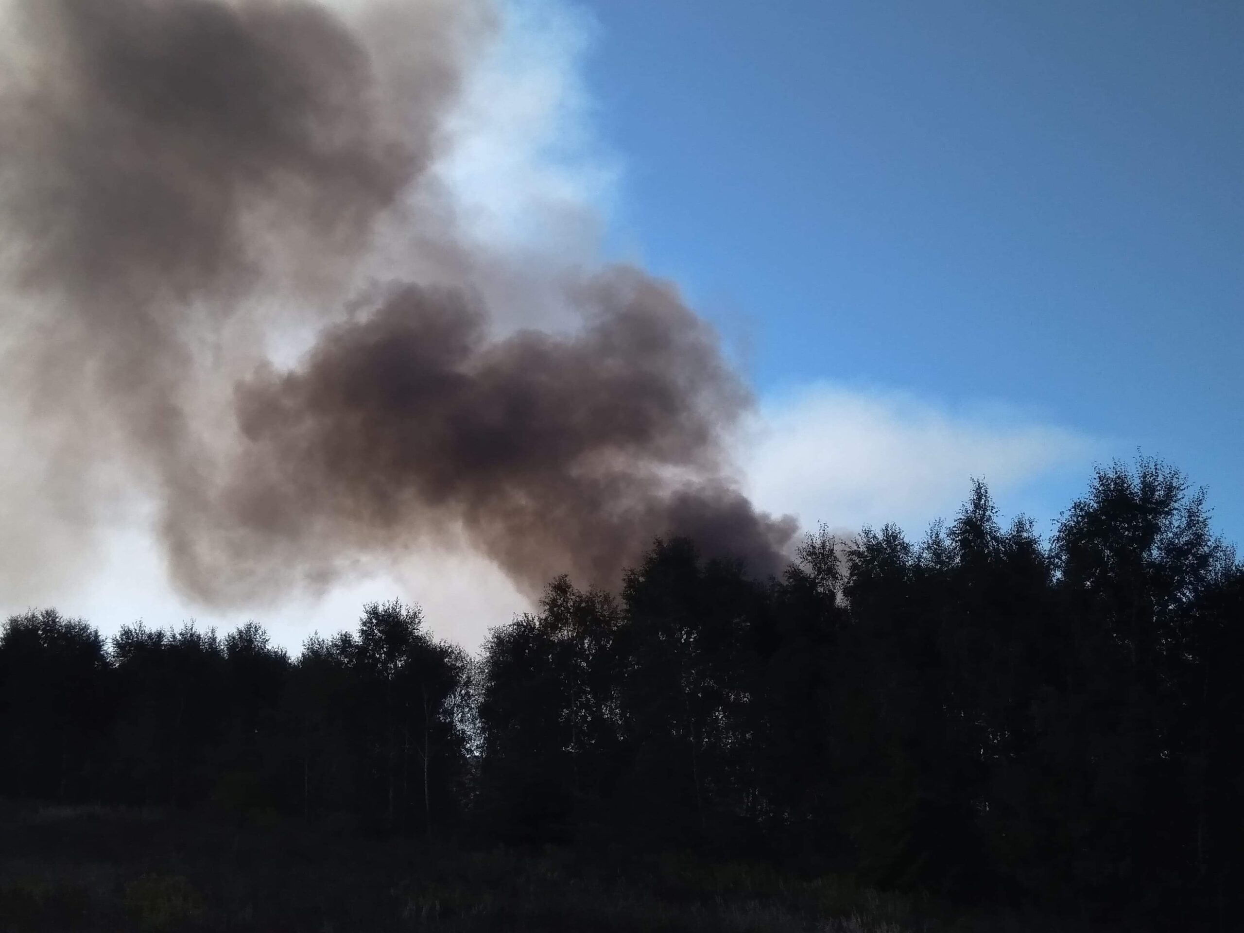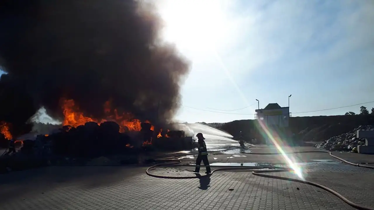 Z daleka widać czarny słup dymu, który unosi się nad składowiskiem.