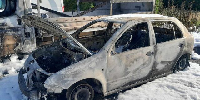 Z ogniem walczyły cztery zastępy strażaków. Pożar został opanowany. Niestety dwa samochody spłonęły doszczętnie. To skoda i dostawczak.
