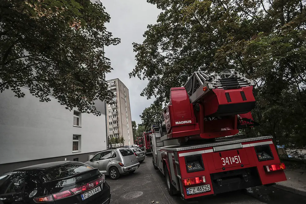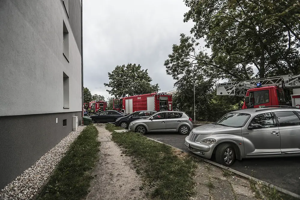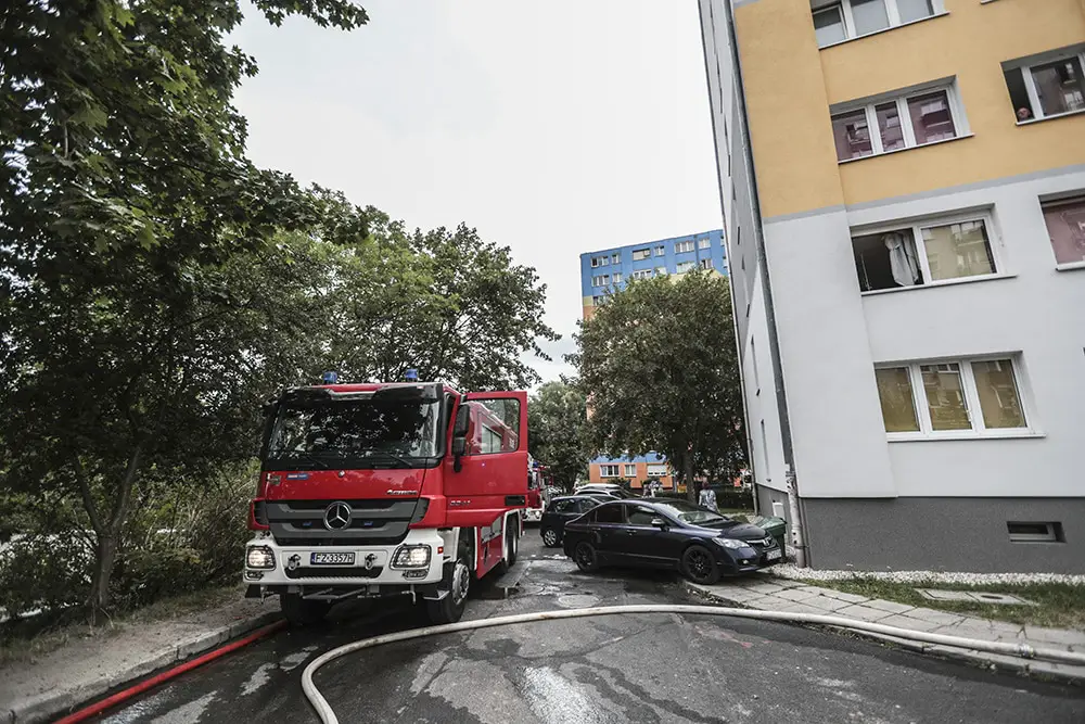 Na miejsce pożaru przyjechały cztery jednostki straży pożarnej. Z mieszkania na 9. piętrze wydobywał się gęsty dym. Do środka weszli strażacy oraz policjanci. Policjanci wynieśli z mieszkania pijanego mężczyznę. Ranny został zabrany karetką do szpitala. Strażacy szybko opanowali niebezpieczną sytuację oraz oddymili klatkę schodową.
