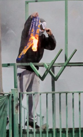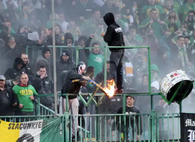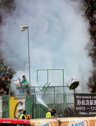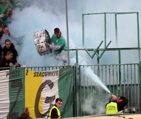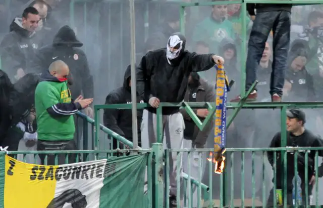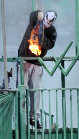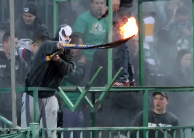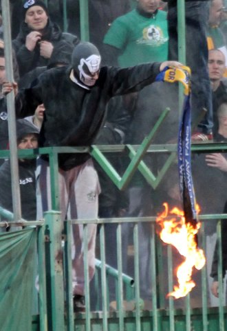 Zamaskowany mężczyzna podpalił szalik zapalniczką i zaczął nim wymachiwać. Ochrona na stadionie próbowała ugasić szalik gaśnicą. Nie udało się. Mężczyzna po interwencji ochrony pojawił się z płonącym szalikiem, który po chwili rzucił na stadion.