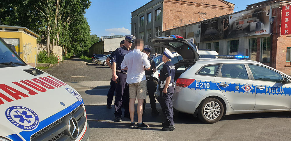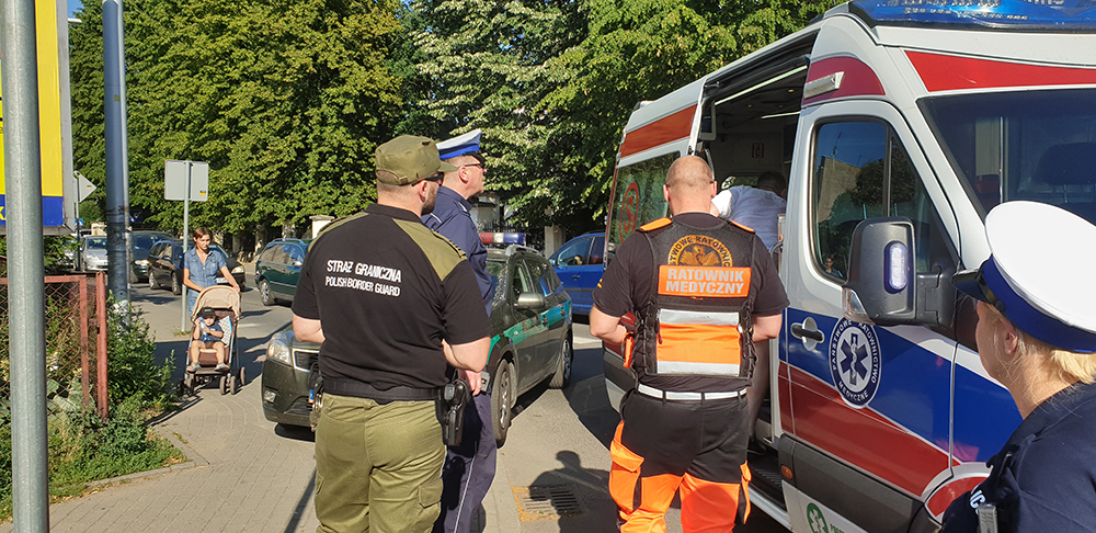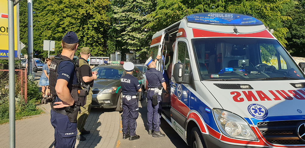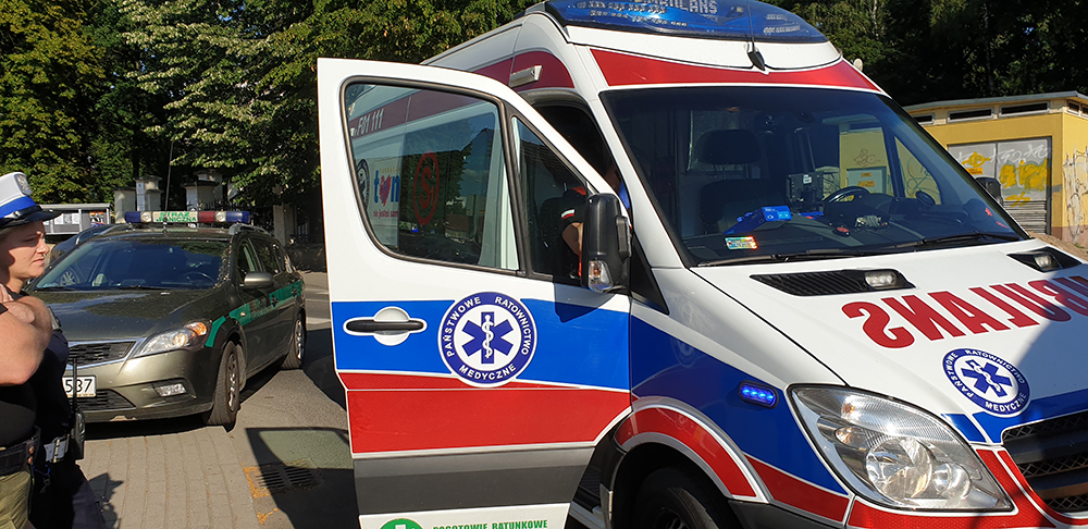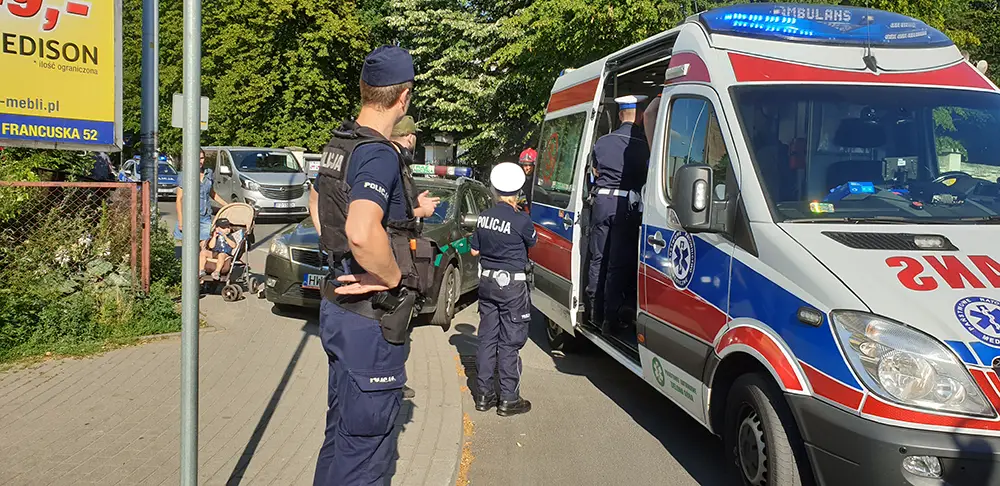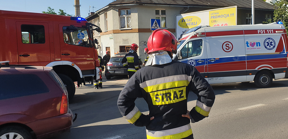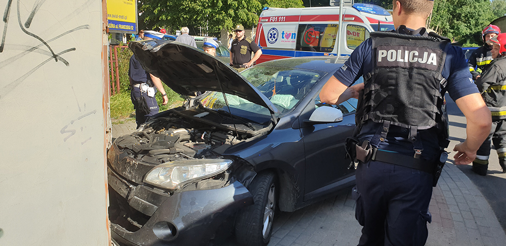 Siła uderzenia była tak duża, że w aucie wystrzeliły poduszki powietrzne. Świadkowie na miejsce zdarzenia wezwali służby ratunkowe. Dojechały wozy straży pożarnej oraz karetka pogotowia ratunkowego. Kierowca i pasażerka zostali zabrani do karetki. Mężczyzna po badania wyszedł z karetki i został zabrany do radiowozu. Kobieta została w karetce.