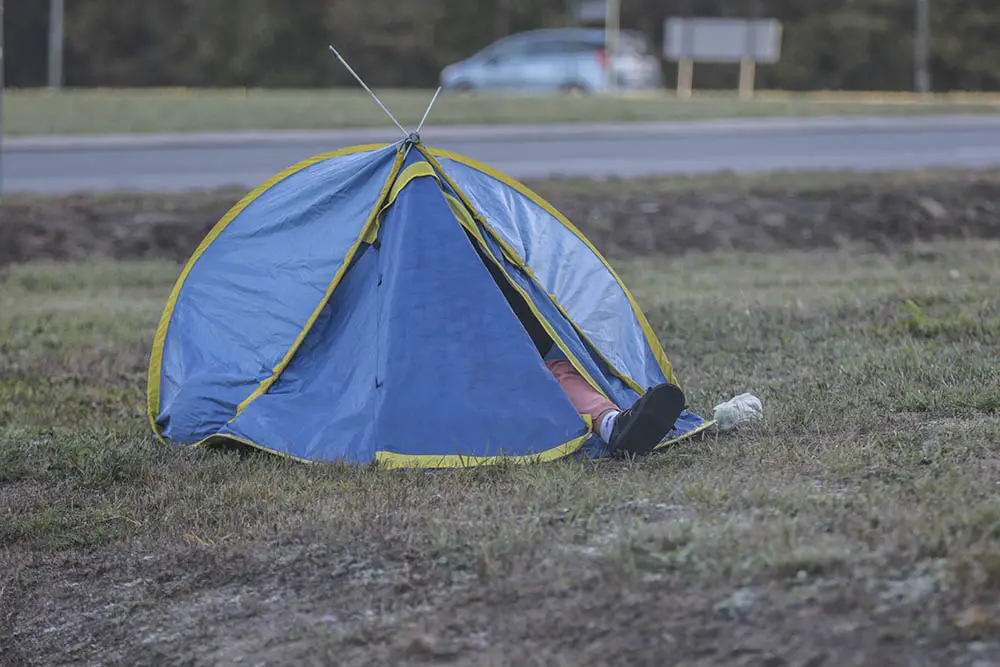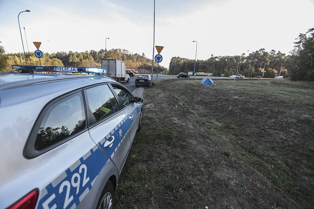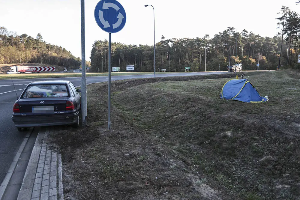 W poniedziałek, 8 października, kierowcy wjeżdżający do Zielonej Góry rondem Piastów Śląskim, ze zdziwieniem spoglądali na maleńki namiot rozbity tuż przy drodze. Na jezdni stał rozbity opel. Miał wyrwane przednie koło. Kierowcy o namiocie przy rondzie i rozbitym aucie zawiadomili policję. Na miejsce natychmiast pojechał patrol.