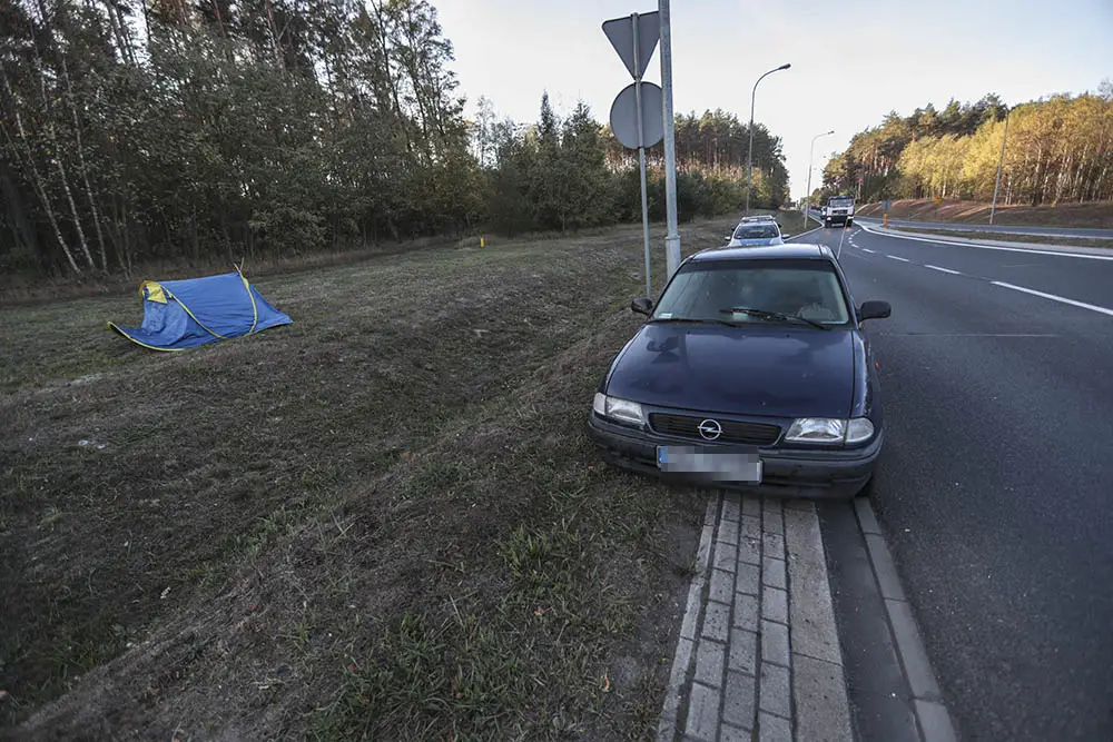 Policjanci potwierdzili rozbity mały namiot stojący tuż przy drodze i uszkodzony samochód. Kiedy zapukali do namiotu okazało się, że w środku śpi kobieta. Mundurowi obudzili ją. To kierująca uszkodzonym oplem stojącym obok na drodze.