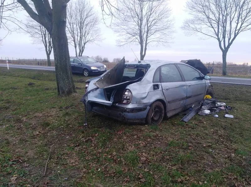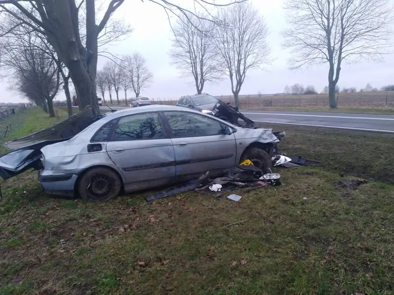 Kompletnie rozbity citroen stoi na poboczu przy wylocie na Żary z drogi krajowej nr 27. Samochód brał udział w mocnym zderzeniu.