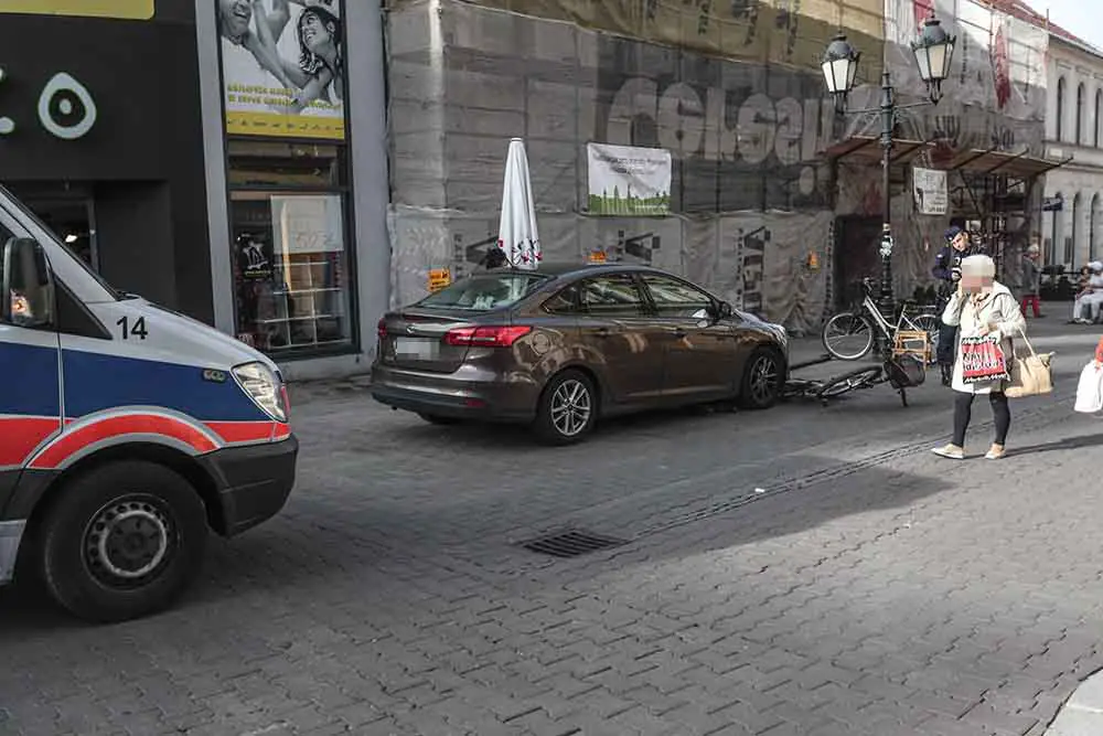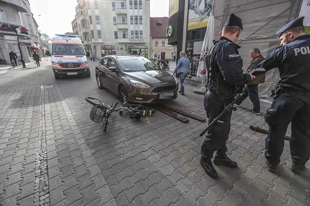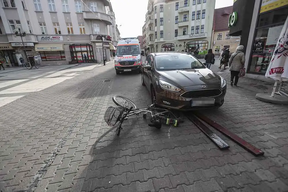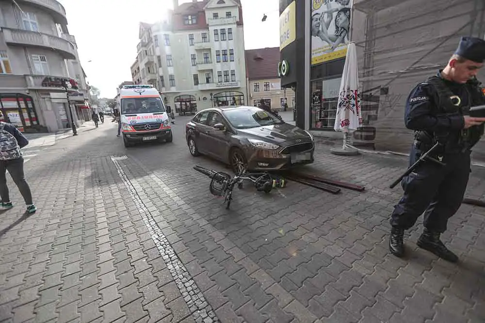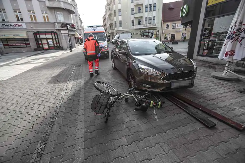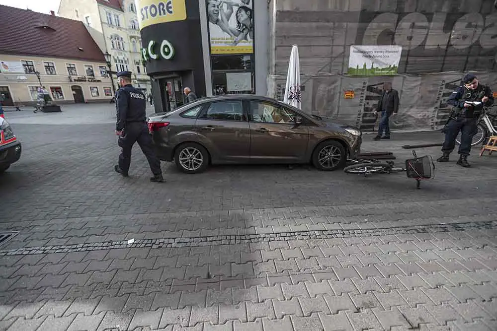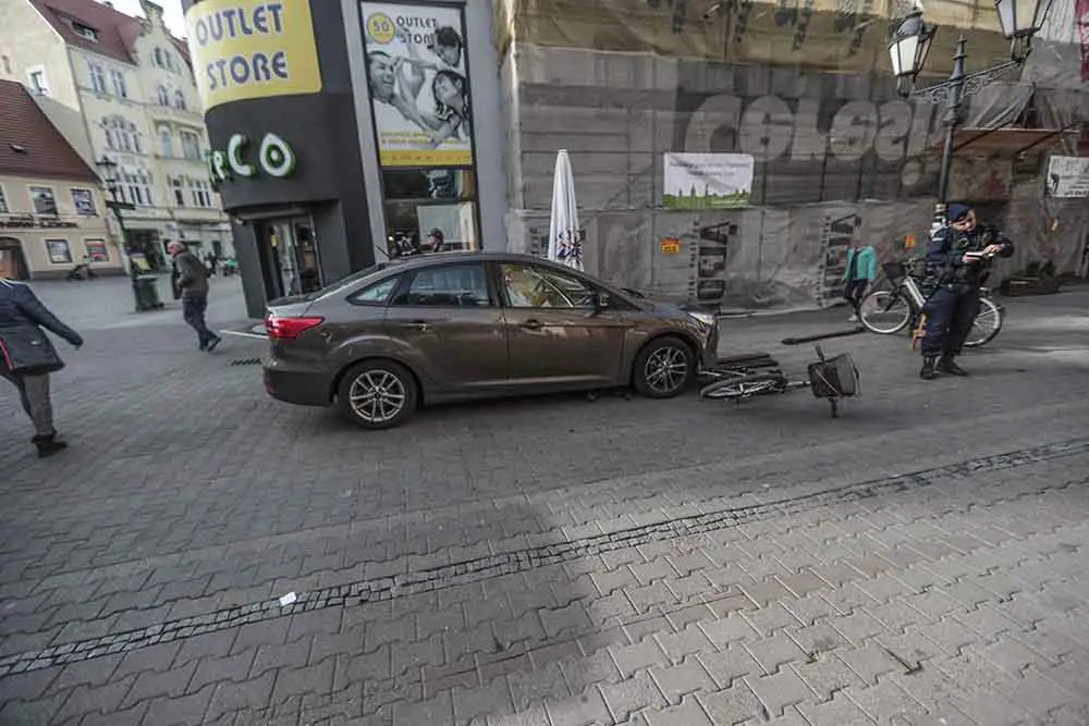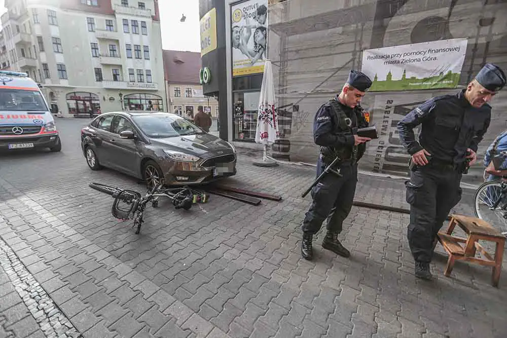 Do zdarzenia doszło we wtorek, 9 października, na starówce w Zielonej Górze. Staczający się samochód bez kierowcy potrącił rowerzystkę i rozbił ławkę.