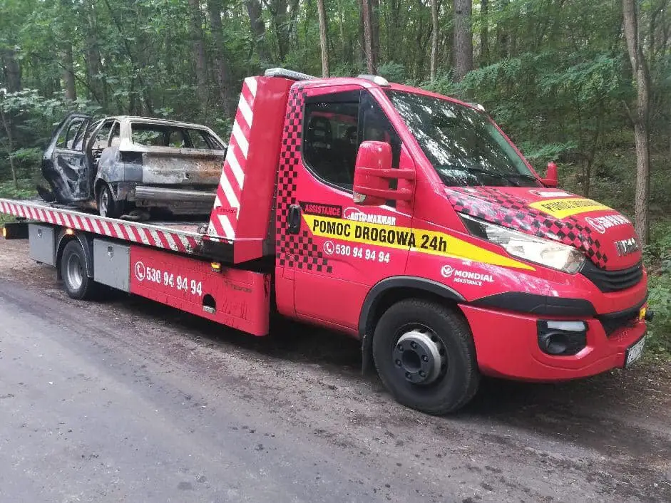 Spalony samochód na polecenie zielonogórskiej policji zabezpieczyła pomoc drogowa Maxmar.