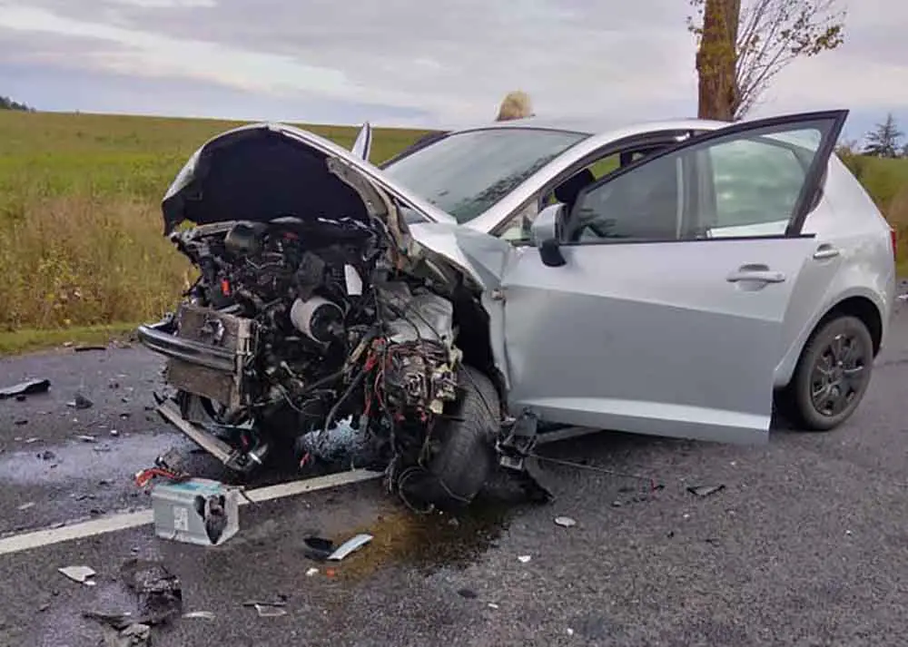 Do bardzo poważnie wyglądającego zderzenia samochodów doszło w piątek, 16 października, trasie koło Lubska. Seat czołowo uderzył w volkswagena.