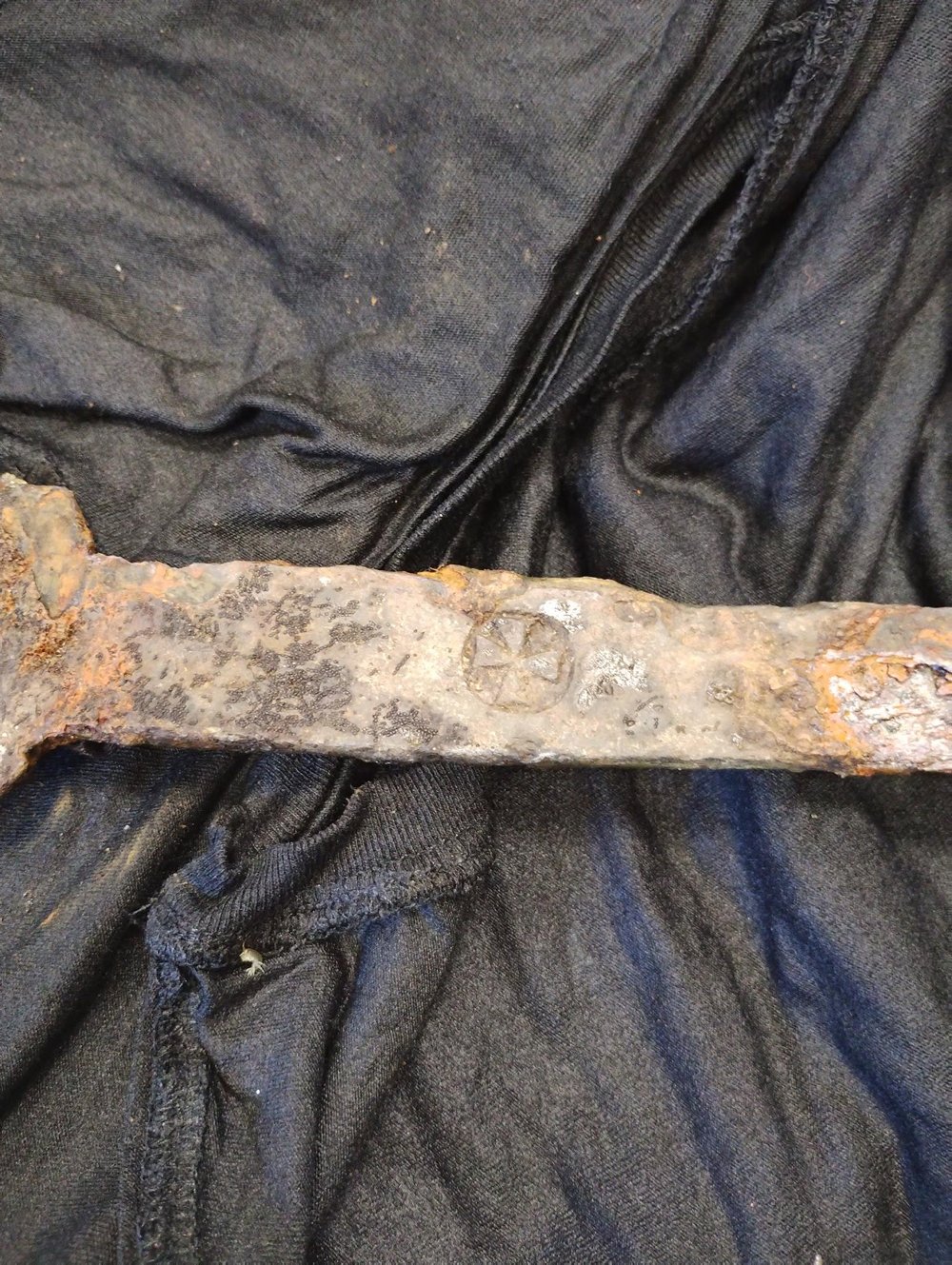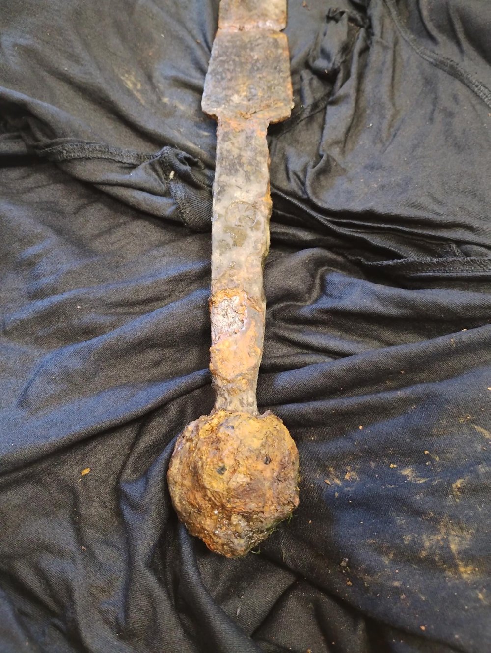 Miecz, który zachował się w niemalże pełnej długości, wyróżnia się charakterystyczną kulistą głowicą oraz intrygującym znakiem krzyża umieszczonym na trzonie. Te cechy sugerują, że mógł to być przedmiot o znaczeniu ceremonialnym lub wojskowym, używany przez rycerzy w średniowiecznych czasach. Znalezisko stanowi cenny dowód na historię regionu oraz na życie i zwyczaje ludzi sprzed wieków.