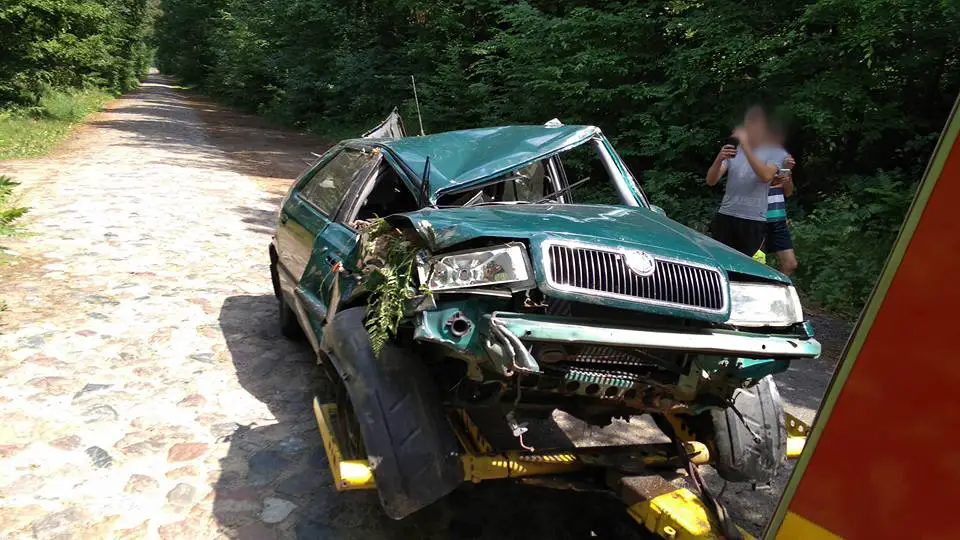 Kierowca skody podczas jazdy wypadł z drogi. Samochód na poboczu dachował na koniec uderzając w drzewa. Na miejsce przyjechały służby ratunkowe i policja.