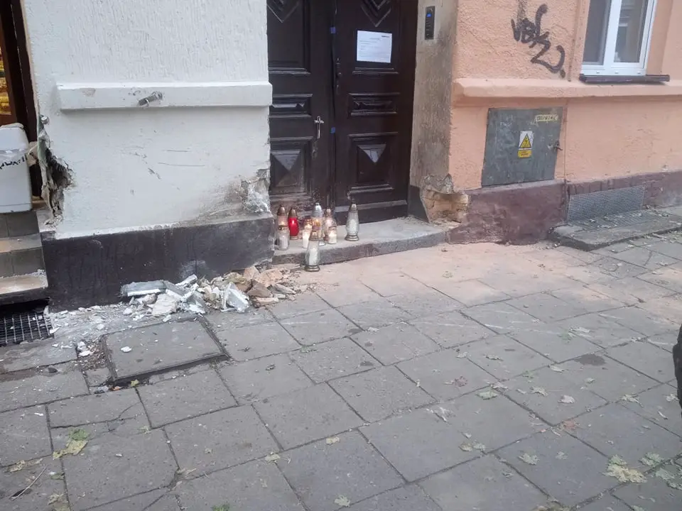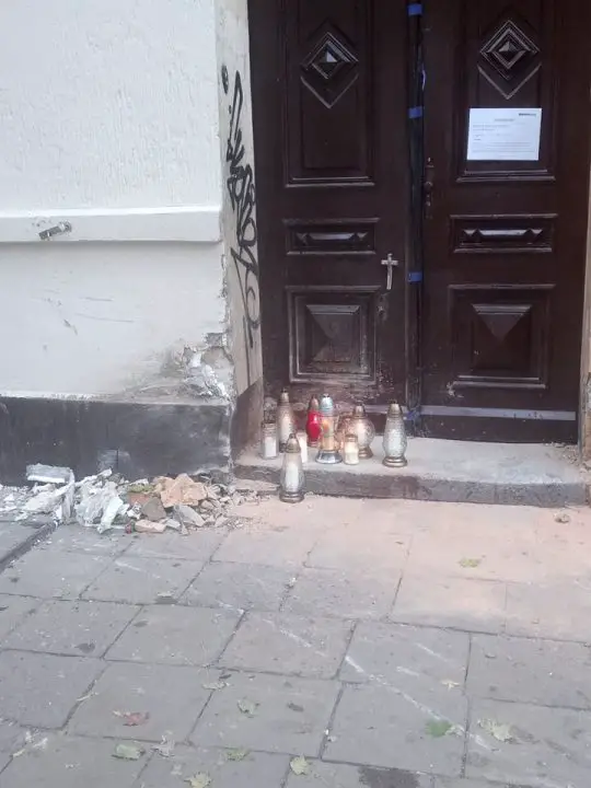 Na ul. 30 Stycznia cały czas płoną znicze. Ktoś przyniósł wielkiego pluszowego misia. Inna osoba przybiła do drzwi krzyż.