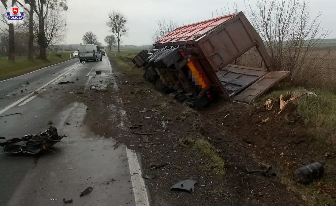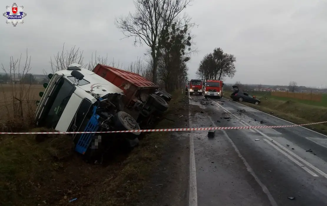 Jak wstępnie ustalili policjanci z drogówki w Krasnystawie, 41-latek jechał audi. Kierujący nie dostosował prędkości jazdy do warunków panujących na drodze i zjechał na przeciwległy pas ruchu. Tam audi z ogromną siłą uderzyło czołowo w jadącą z naprzeciwka ciężarówkę. Po zderzeniu oba auta wypadły z drogi. Ciężarówką przewróciła się na poboczu.