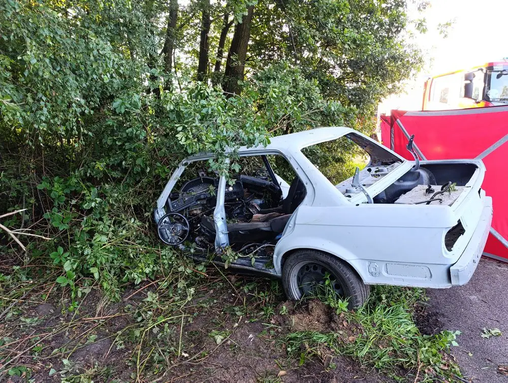 Zdekompletowany samochód bez drzwi, szyb, świateł, pasów bezpieczeństwa i tablic rejestracyjnych uderzył w drzewa. 30-letni mężczyzna taką jazdę przypłacił własnym życiem. Zginął na miejscu.