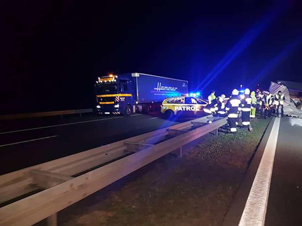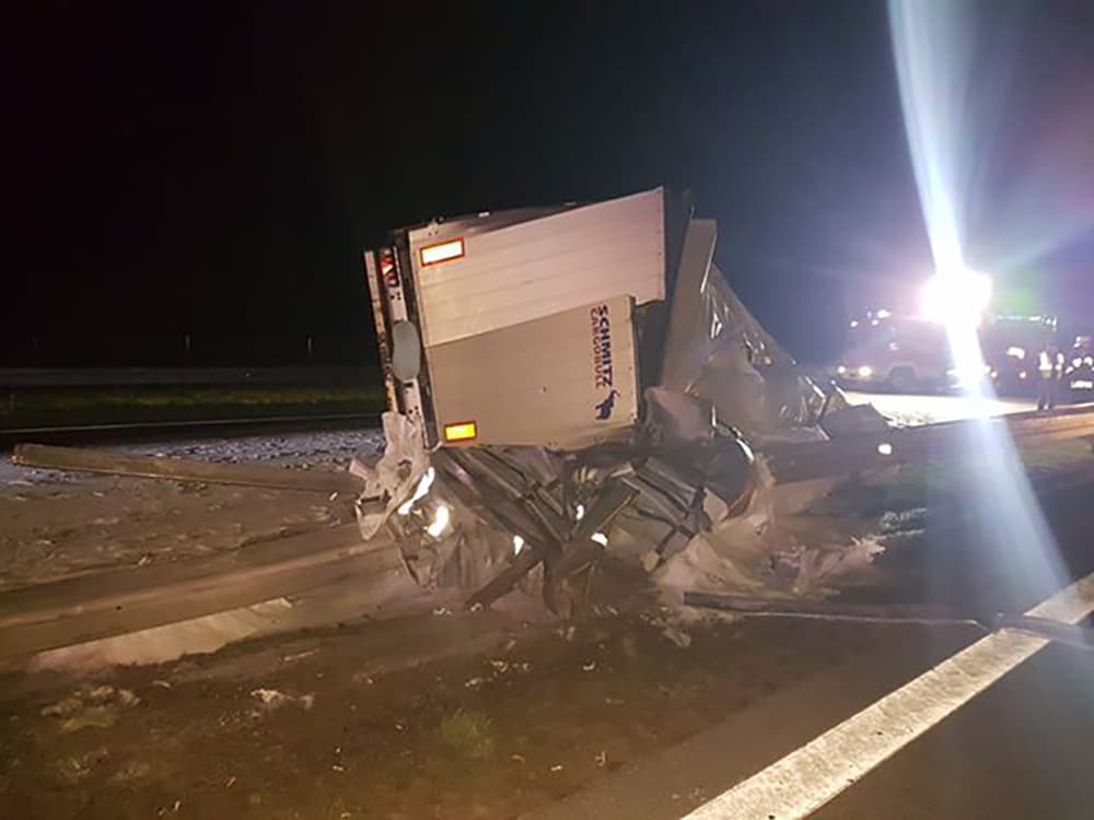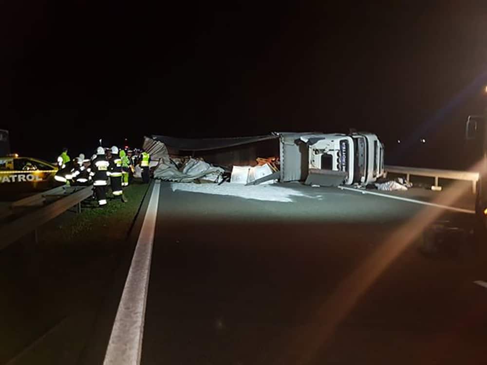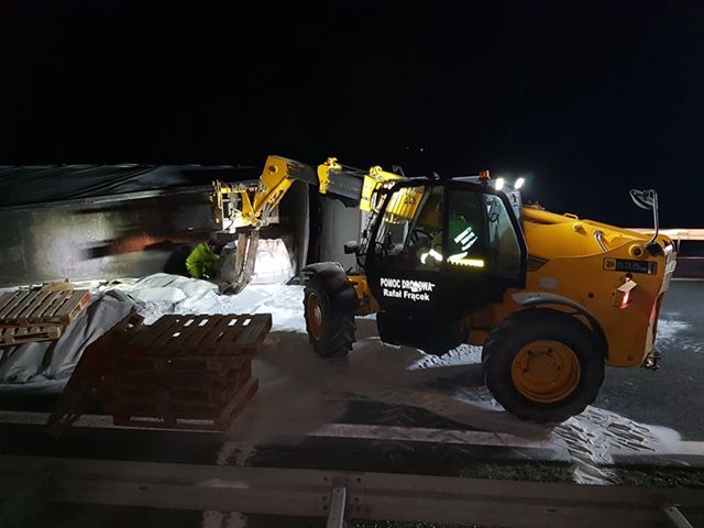 Wtedy w peugeota uderzyła druga ciężarówka. Jedna z ciężarówek rozerwała bariery energochłonne i przewróciła się. Na drogę wysypał się przewożony przez ciężarówkę cukier.