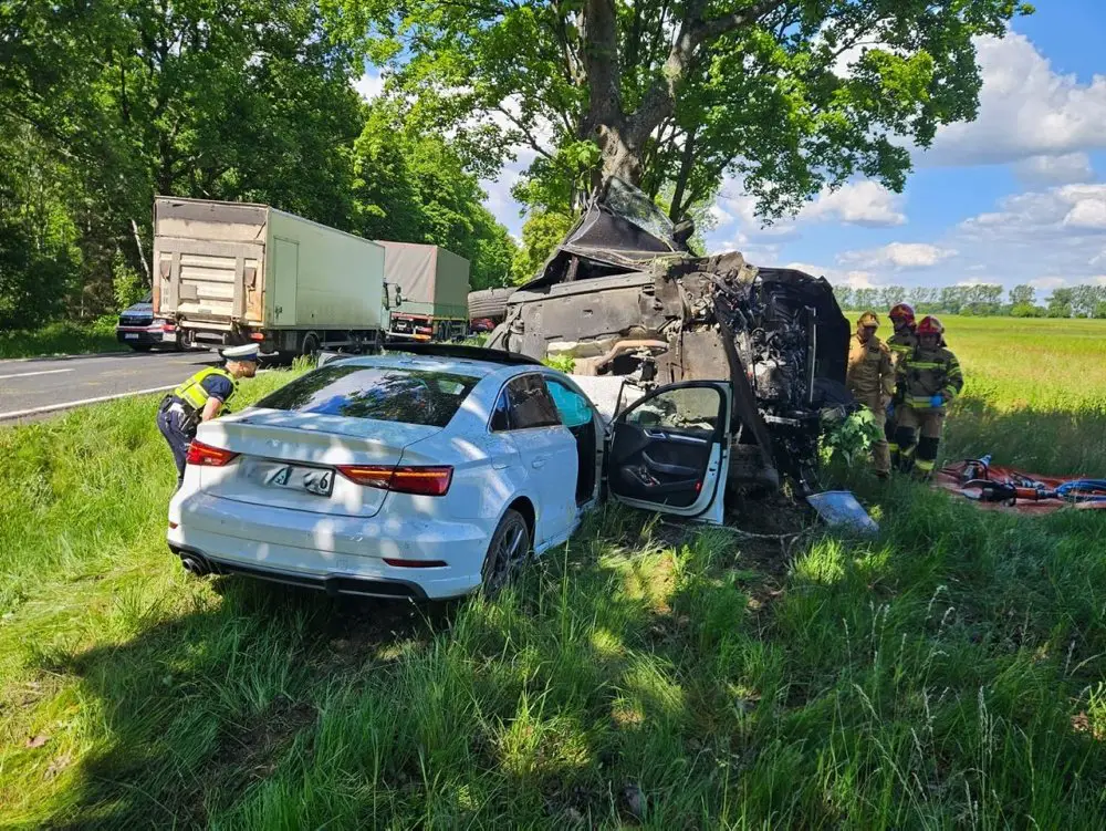 Na miejscu zginął kierowca audi Q7. Dwie ranne kobiety z drugiego audi zostały zabrana do szpitala.