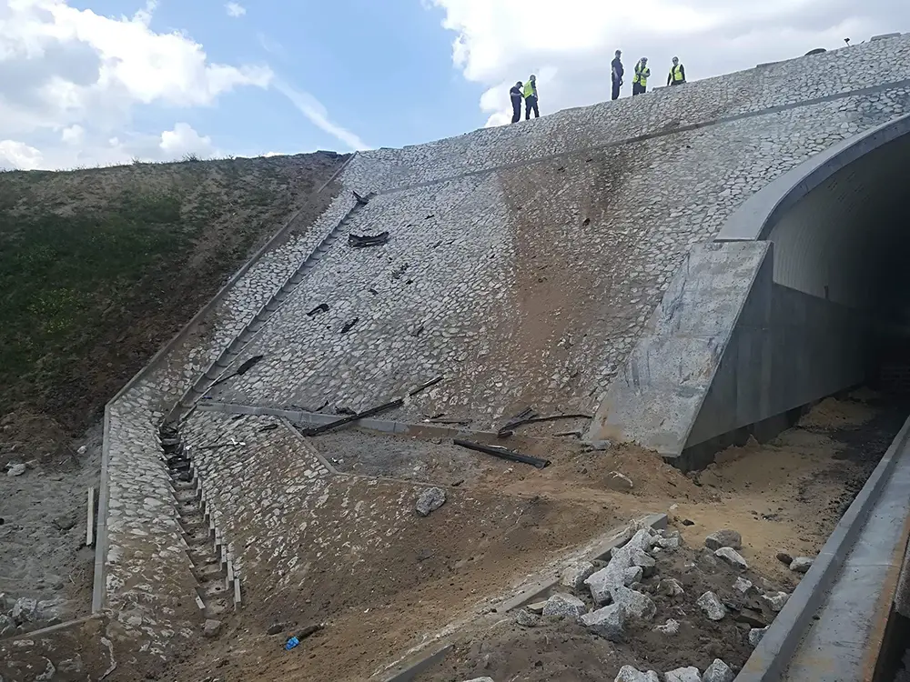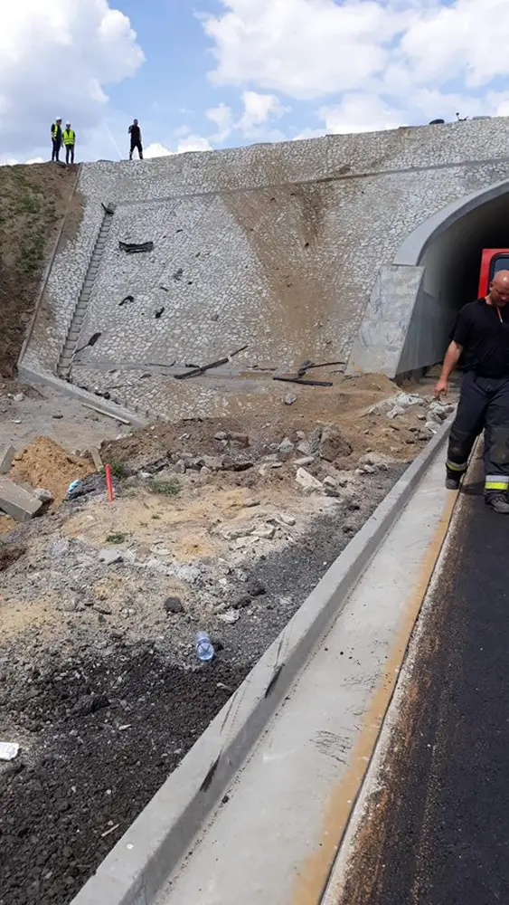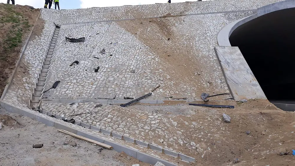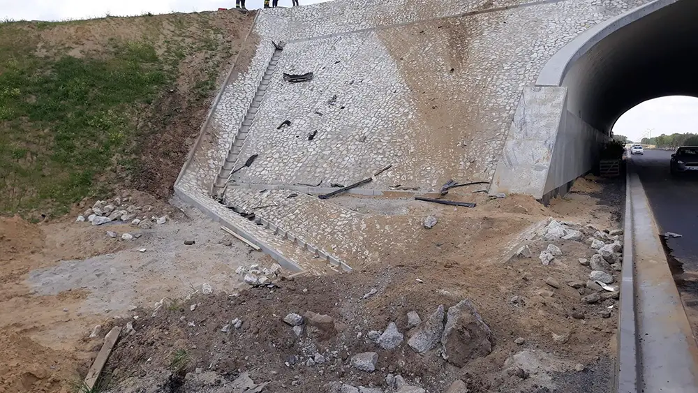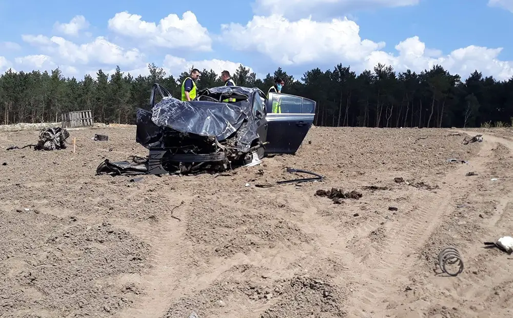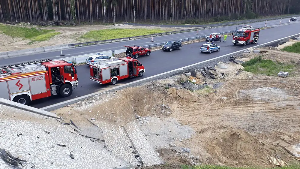 Rozpędzone auto z ogromną siłą uderzyło w betonowy wiadukt w budowie. Uderzenie było potężne. Z chevroleta nic nie zostało. Samochód w dodatku wyleciał na wzniesienie za wiaduktem.