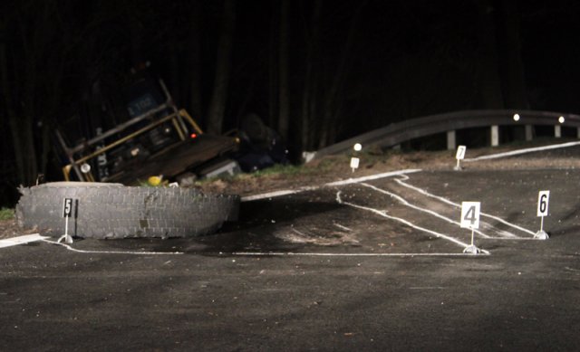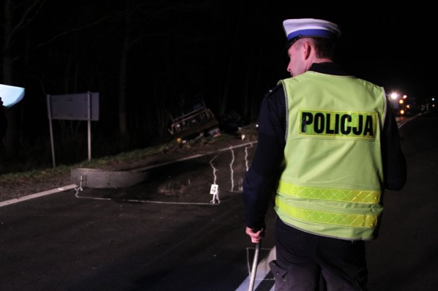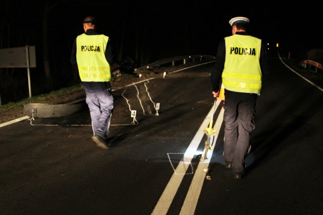 Trasa śmierci godz. 19.30 zablokowana. Ciężarówki i auta osobowe stoją z dwóch stron przed zakrętami na wysokości miejscowości Piaski. Przejazdu pilnuje policja i straż pożarna. Kawałek dalej migają światła policji i straży pożarnej. Policjanci chodzą po drodze, Na jezdni widać namalowane kredą znaki, przy nich duże czarne cyfry na białym tle. Pomagają policji oznaczyć ślady niezbędne do dokumentacji z miejsca wypadku.