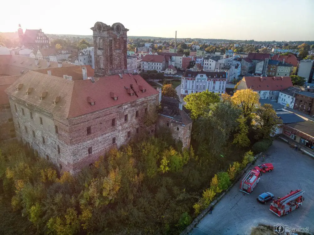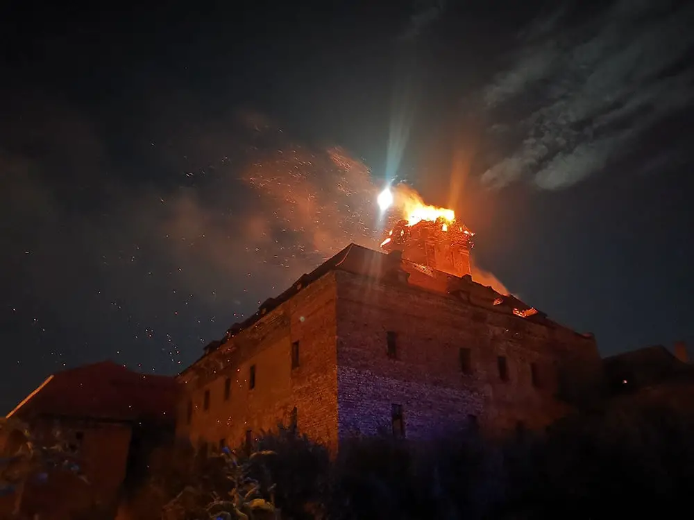 Kiedy wybuchł pożar na miejsce zaczęły dojeżdżać wozy straży pożarnych w z miasta i okolic. Dojechał również wóz z podnośnikiem strażaków z Zielonej Góry. To był wielki pożar. Cały szczyt wieży natychmiast zajął się ogniem. Sytuacja na miejscu była bardzo ciężka. Strażacy nie mogli wejść do środa obiektu, bo drewniana konstrukcja zamkowej wieży oraz schody są mocno spróchniałe i groziły zawaleniem. W pewnym momencie szczytowa konstrukcja płonącej wieży runęła na dach zamku. Gdyby tam byli strażacy doszłoby do tragedii. Walka z pożarem trwał do godz. 3.30. W poniedziałek, 14 października, nad ranem wozy strażaków znowu pojawiły się koło zamku.