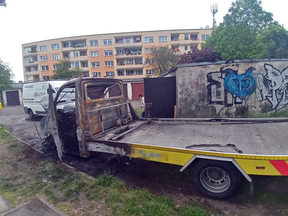 Pożar volkswagena craftera pomocy drogowej wybuchł około godz. 4.30. Samochód palił się od kabiny. Starzący ugasili pożar. Laweta pomocy drogowej została jednak niemal doszczętnie spalona i nie nadaje się już do niczego. Pożar uszkodził również zaparkowanego obok forda mondeo. Nadpalony został przód samochodu. Płomienie uszkodziły również bramę jednego z garaży. Wszystko wskazuje na robotę podpalacza. Laweta została celowo podpalona.