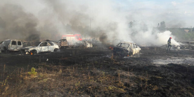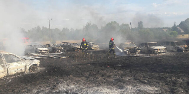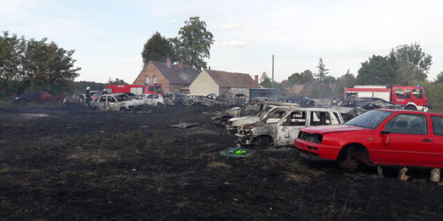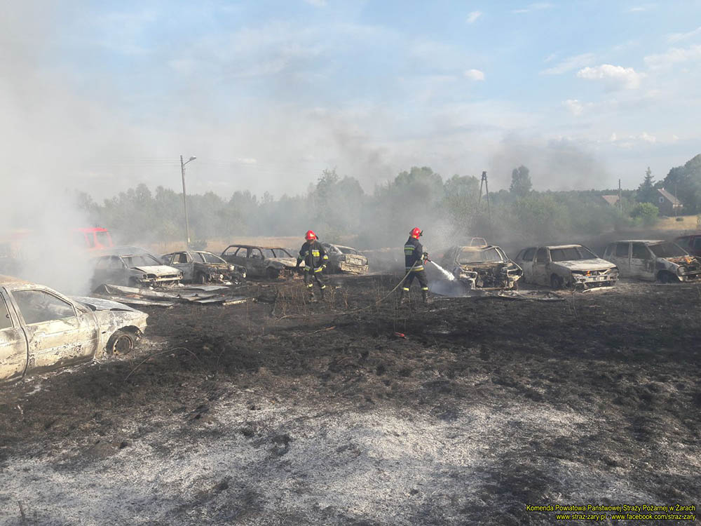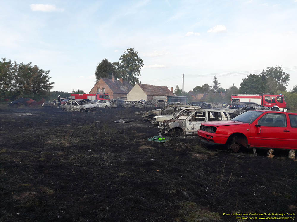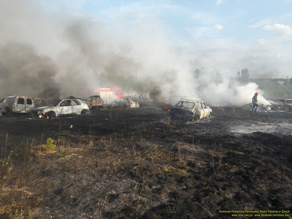 Istniało poważne rozprzestrzenienie się pożaru na okoliczny las. Strażacy ruszyli do walki z ogniem. Cała akcja trwała ponad trzy godziny. Spłonęły 24 samochody osobowe i przyczepka.