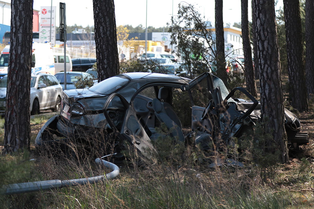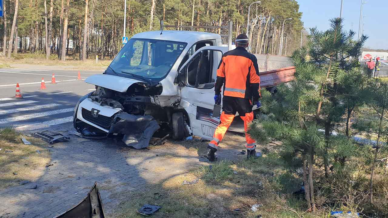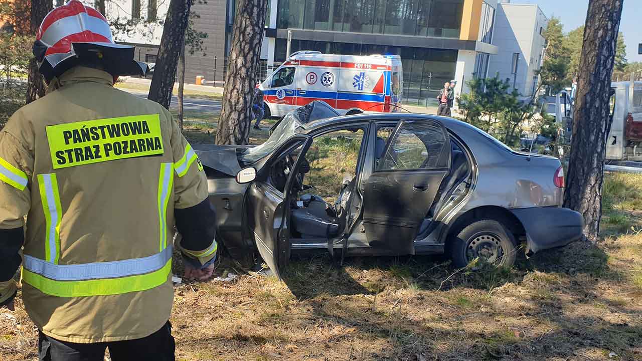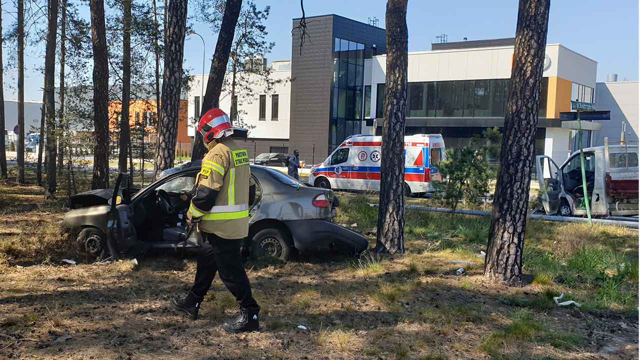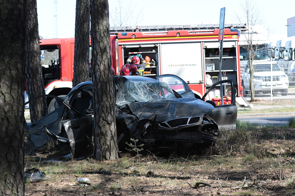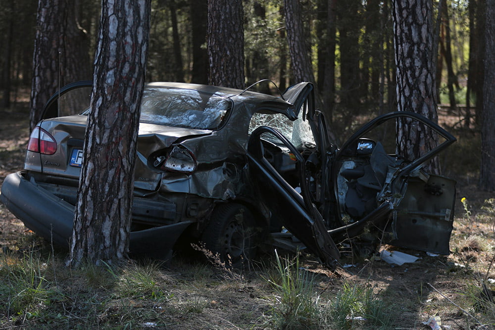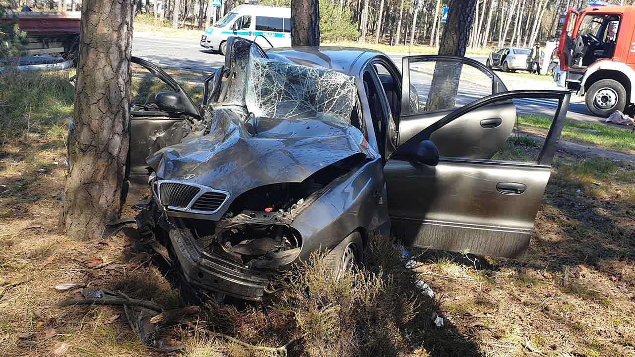 Daewoo lanos jechał ul. Międzyrzecką od Stelmetu. Ulicą Kostrzyńską w górę jechał kierujący samochodem dostawczym. Kierujący samochodem dostawczym nie zatrzymał się na znaku stop i staranował daewoo. Siła zderzenia samochodów była potężna. Lanos wypadł z drogi do lasu i uderzył w drzewo. Pojazd został bardzo mocno rozbity. Strażacy sprzętem hydraulicznym musieli wycinać kobietę z wraku lanosa. Poważnie ranna kobieta z wieloma połamaniami została przewieziona do szpitala karetką pogotowia ratunkowego. Do szpitala trafiły też dwie osoby, kierowca samochodu dostawczego i pasażer lanosa.
